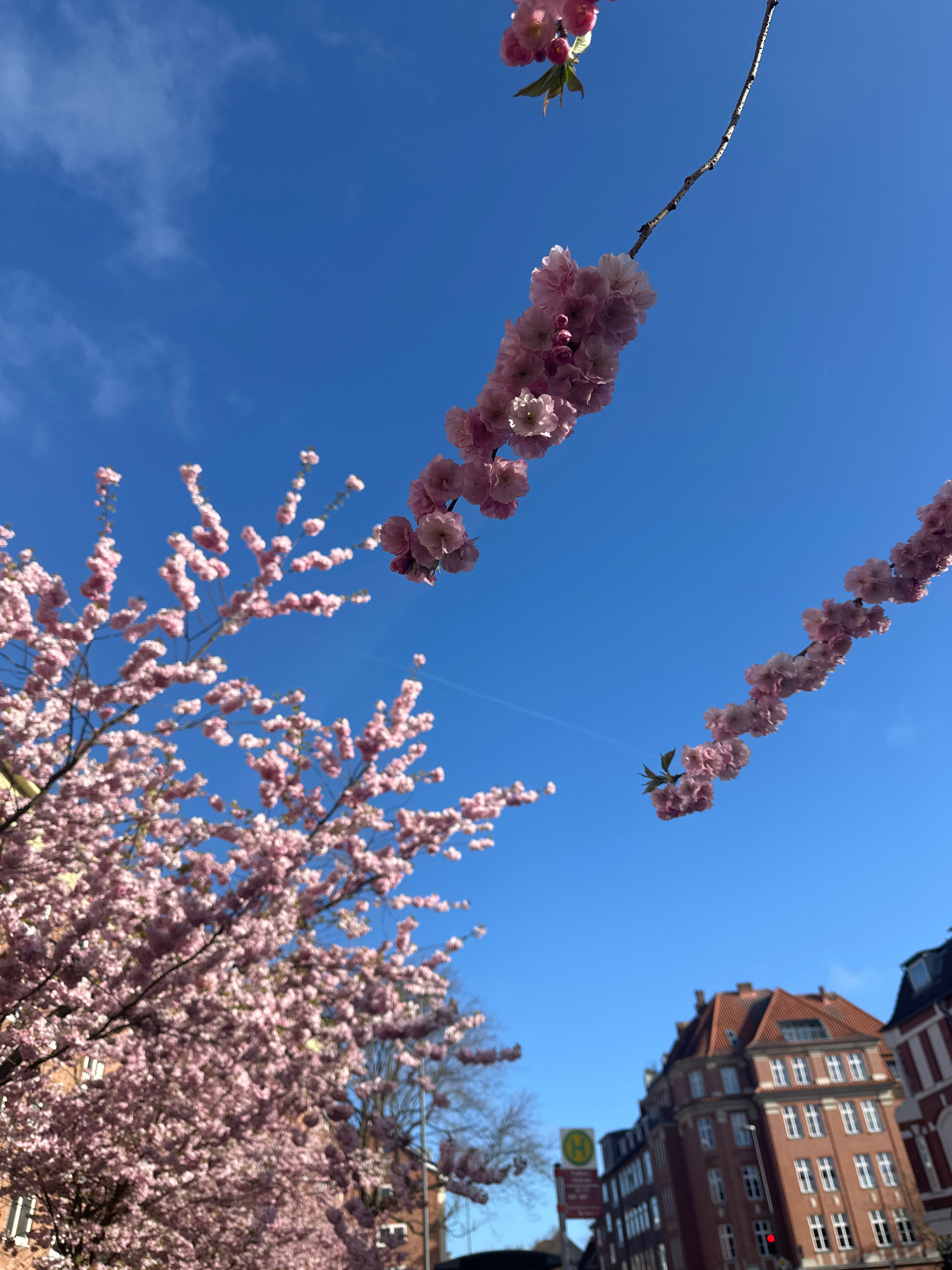 The image shows a low-angle view of cherry blossoms in Kiel, Germany, under a bright blue sky with a few wispy clouds. Branches with clusters of pink cherry blossoms are prominent in the foreground an…read more