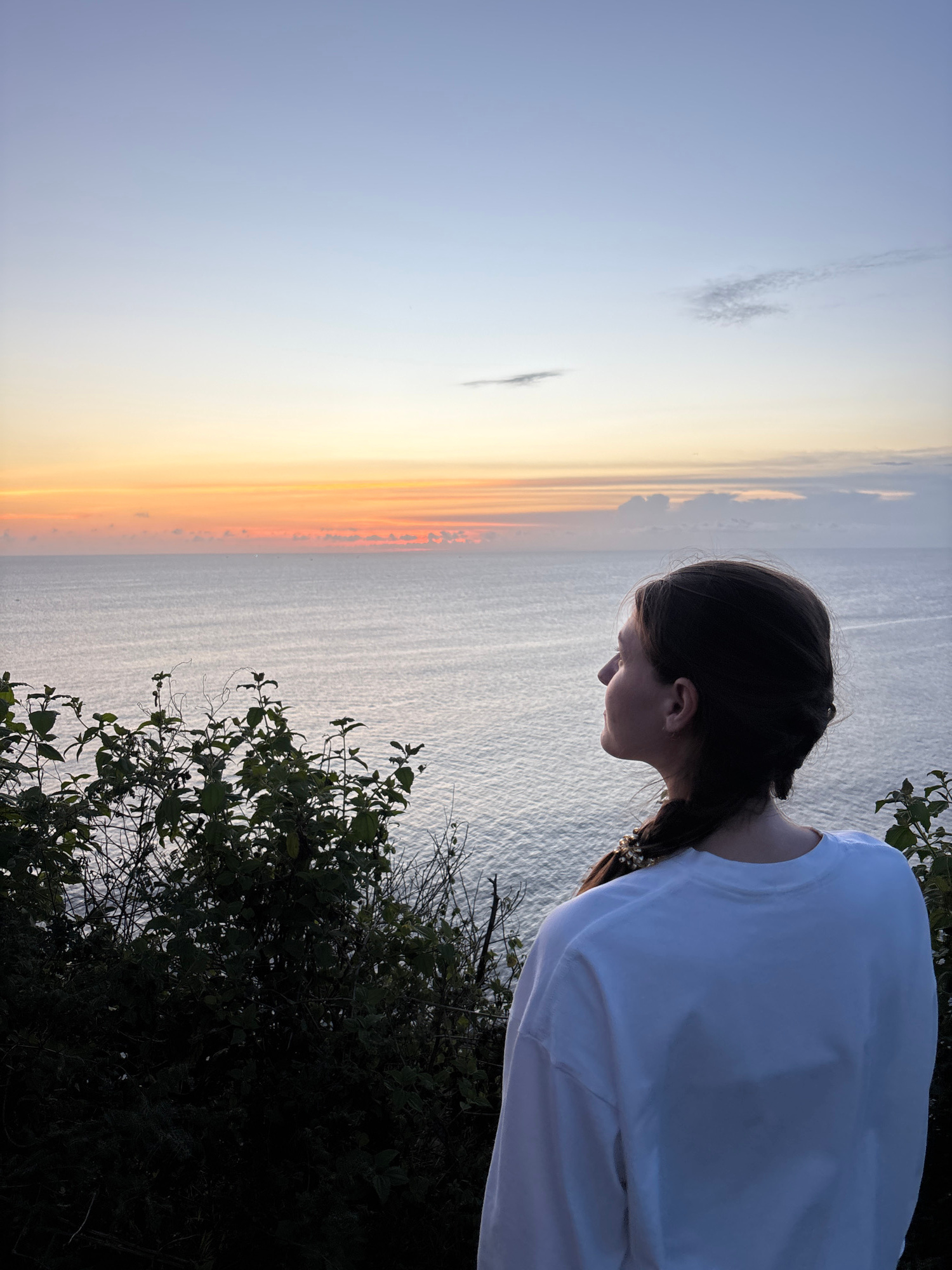 The image captures a person standing on a cliff overlooking the ocean at sunset. The individual, seen from the back and side profile, has brown hair styled in a braid. They are wearing a white, long-s…read more