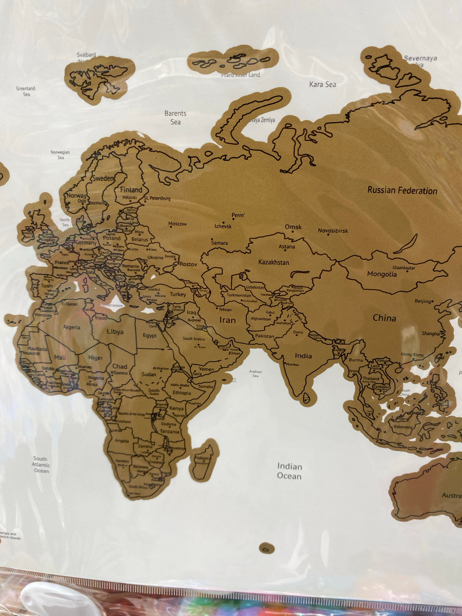 A close-up, overhead shot reveals a scratch-off world map, predominantly displaying Europe, Asia, and Africa. The map features a gold-colored surface with black outlines delineating countries and majo…read more