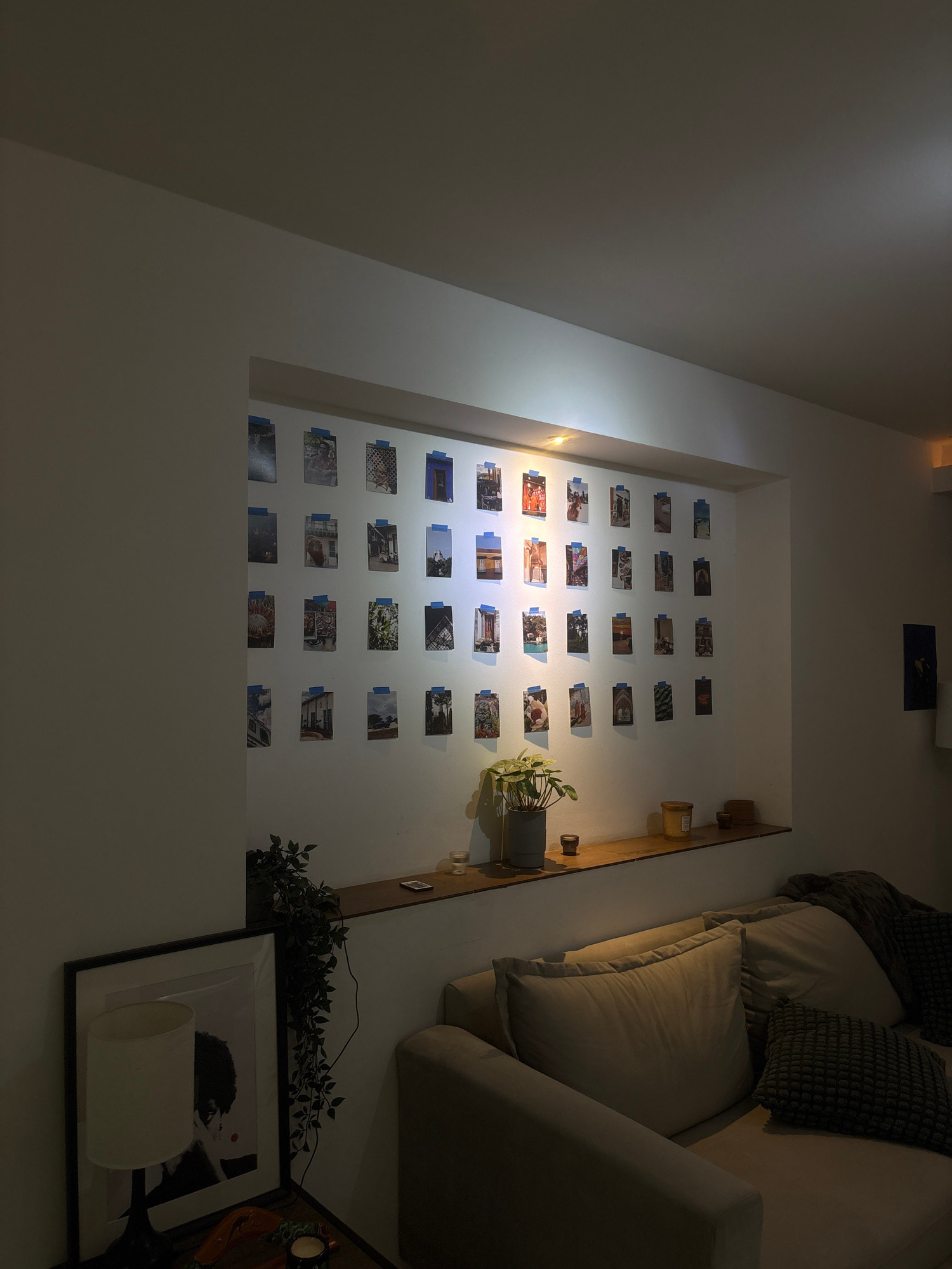 This is an interior shot of a living room. The walls are painted white, and a recessed wall feature displays 24 rectangular photographs attached with blue tape. A wooden shelf runs alongside the right…read more