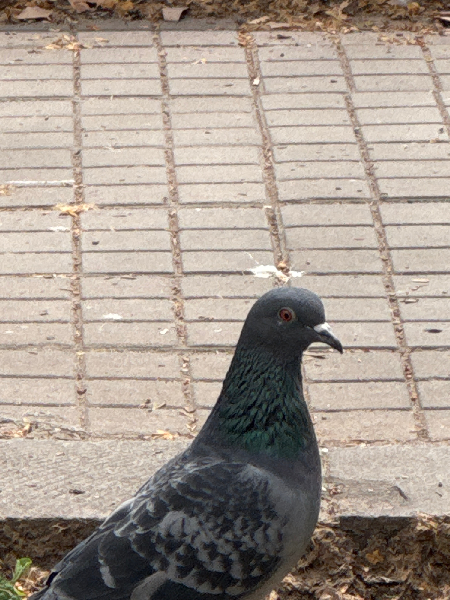 The image shows a pigeon standing on a brick sidewalk in Yerevan, Armenia. The pigeon has gray feathers with iridescent green on its neck and darker mottled feathers on its back. The sidewalk is compo…read more