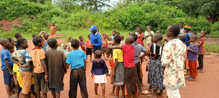 An outdoor scene in Ngalula, Democratic Republic of the Congo, depicts an adult male interacting with a group of approximately 25 to 30 children. The adult, positioned near the center of the frame, we…read more