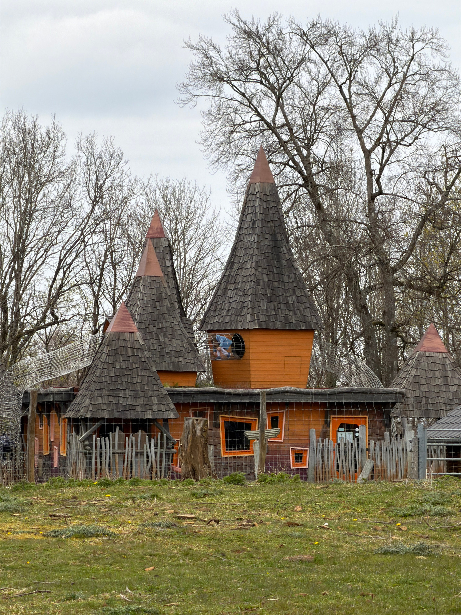 The image shows a multi-tiered, tower-like structure with pointed roofs made of gray shingles. The structure, possibly a playhouse or whimsical building, features several windows with orange frames, a…read more