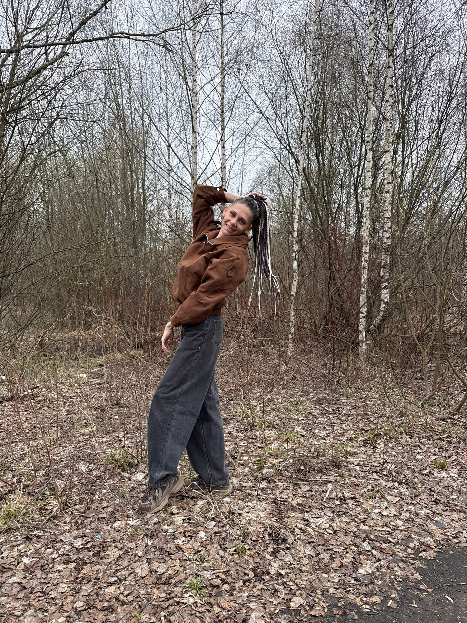 A woman poses outdoors in a wooded area. The woman is wearing a brown jacket and gray jeans. The environment includes trees with bare branches, a ground covered with dead leaves, and some evergreen sh…read more
