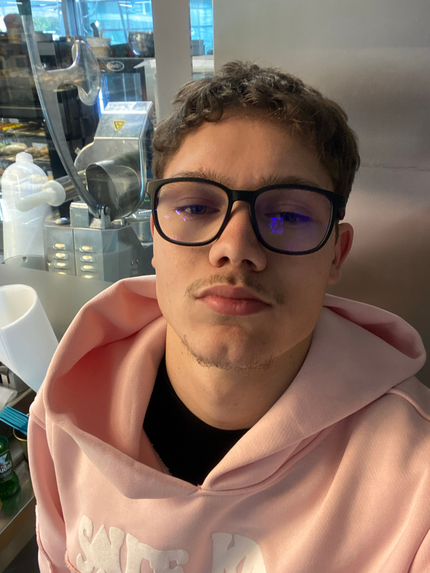The image displays a young man, likely in his late teens or early twenties, looking directly at the camera. He has dark, curly hair and is wearing black-framed glasses, in which blue and white reflect…read more