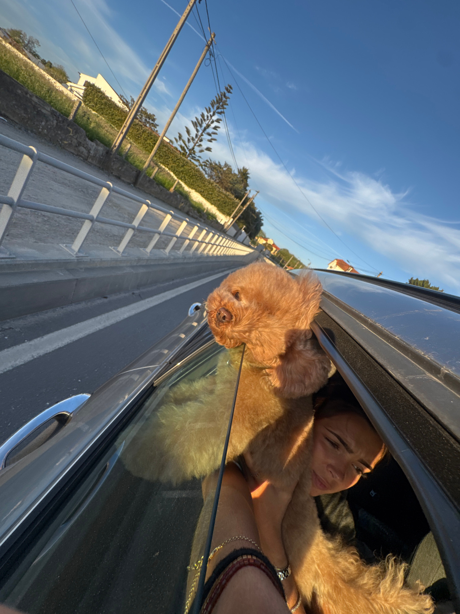 A tan poodle is sticking its head out the window of a gray car, and being hugged by a woman inside the vehicle. The car is traveling on a road alongside a pedestrian walkway with a metal railing. In t…read more