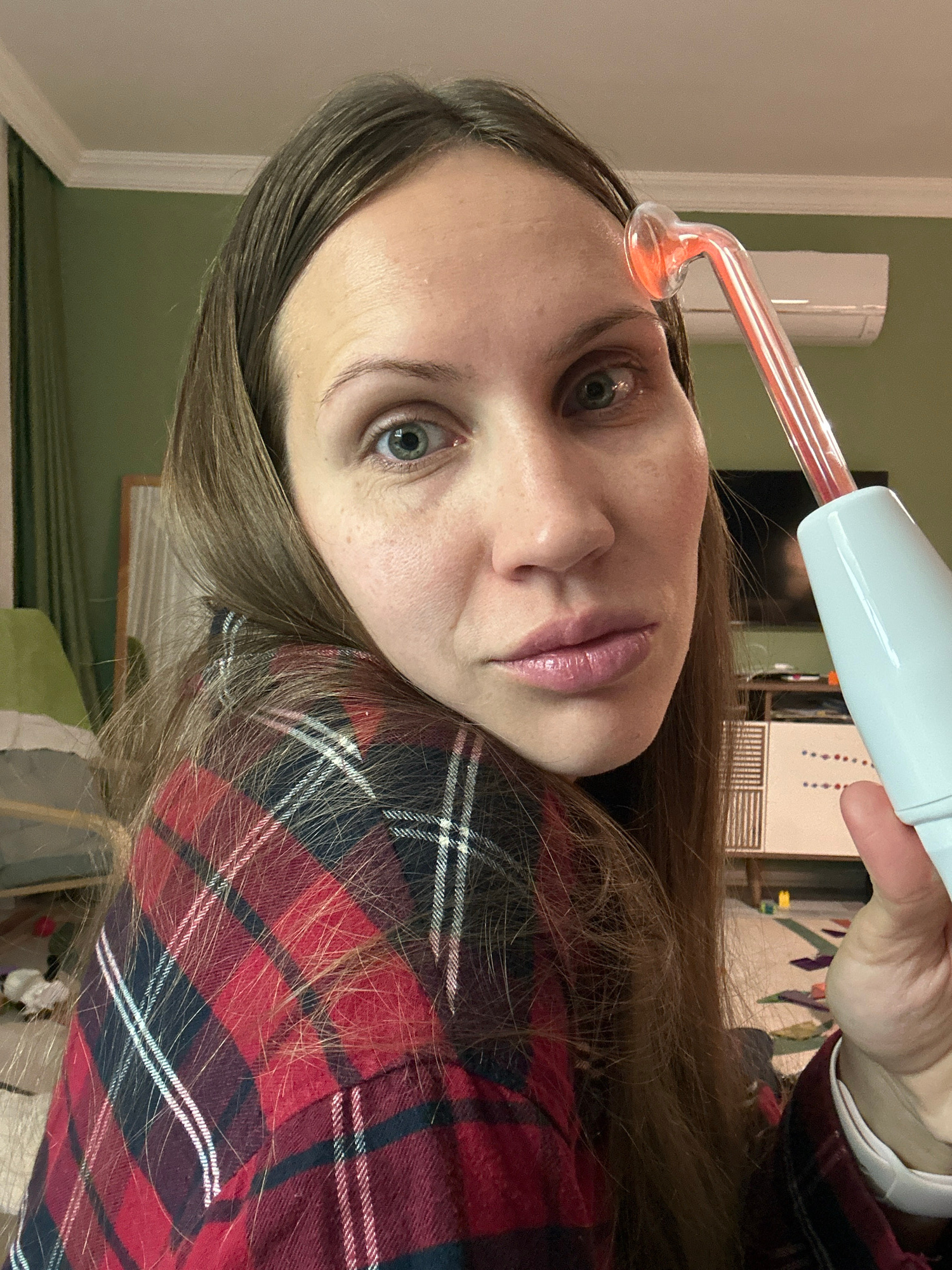A woman is holding a high frequency wand device. The glass end of the wand is touching her forehead. The wand's base is white plastic. The woman has light brown hair and blue-grey eyes. She is wearing…read more