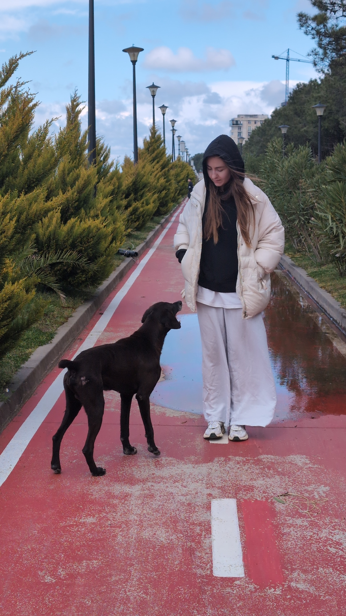 A young woman with long brown hair and a black hooded sweatshirt beneath a white puffer jacket stands on a red pathway in Kobuleti, Georgia. She also wears white sweatpants and sneakers. She appears t…read more
