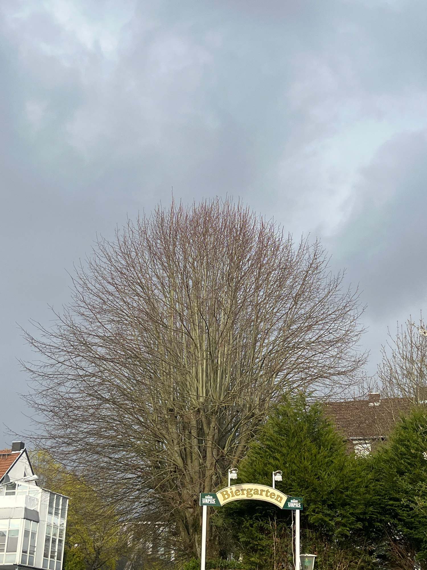 The image depicts an outdoor scene in Saarbrücken, Germany. The sky is overcast with grey clouds. A bare tree with many branches is prominently centered in the frame. Adjacent to the tree, a sign that…read more