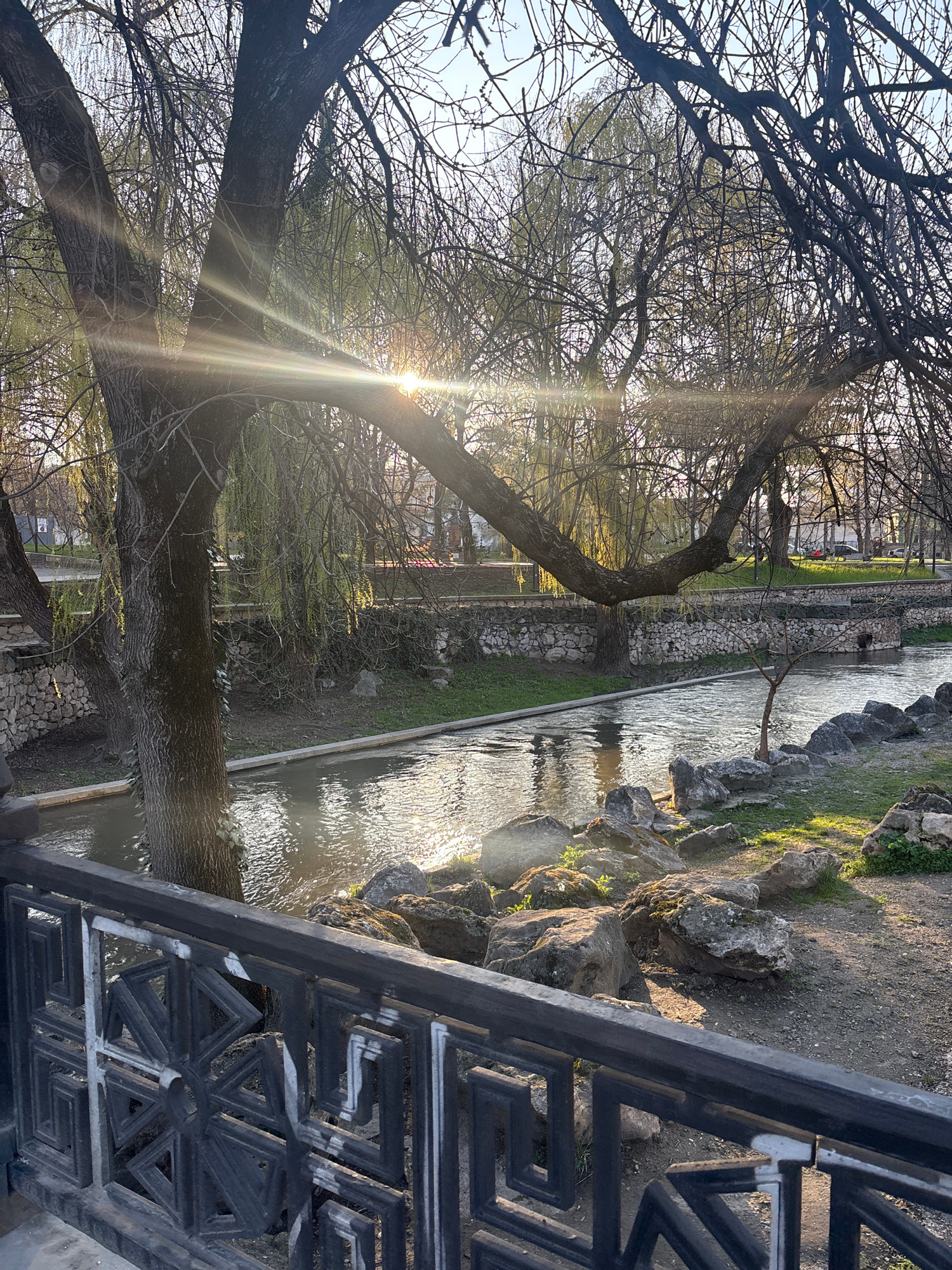 The image depicts a sunlit scene in what appears to be a park in Simferopol, Ukraine, featuring a small, canal-like waterway bordered by stone embankments and greenery. Bare trees with budding leaves…read more