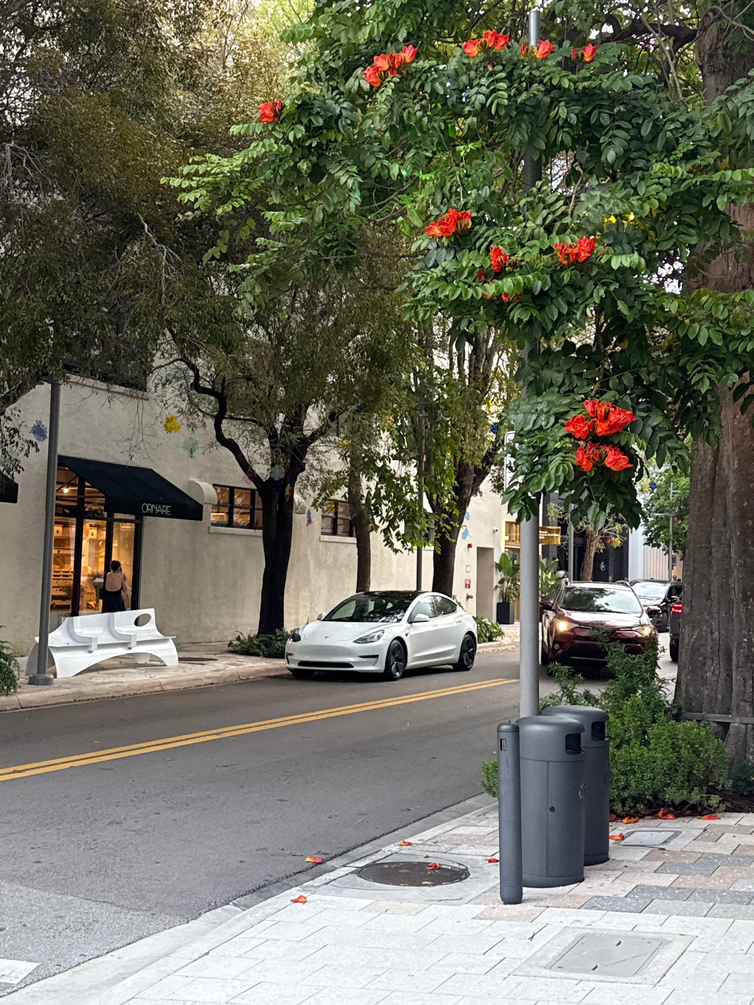 This image shows a street scene in Miami, Florida. The camera faces the street, which has two yellow lines separating the lanes. A white car is parked on the right side of the street. A brown car is v…read more