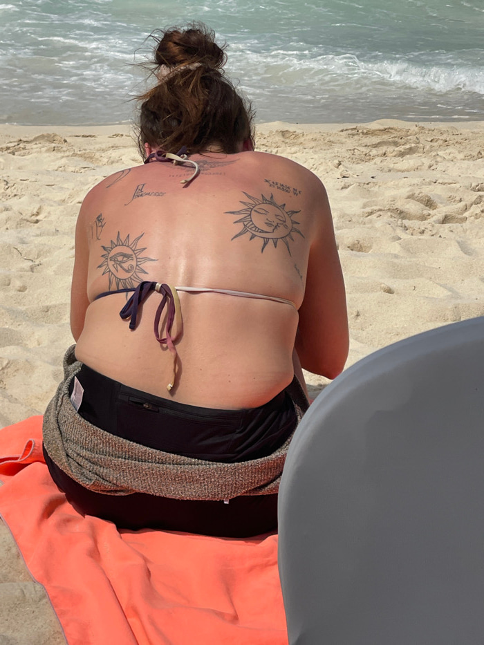 An individual is depicted from behind, seated on a sandy beach at Kendwa Beach, Zanzibar, Tanzania, facing the ocean. The specific location is indicated by coordinates 6° 43' 01" S 39° 11' 18" E tatto…read more