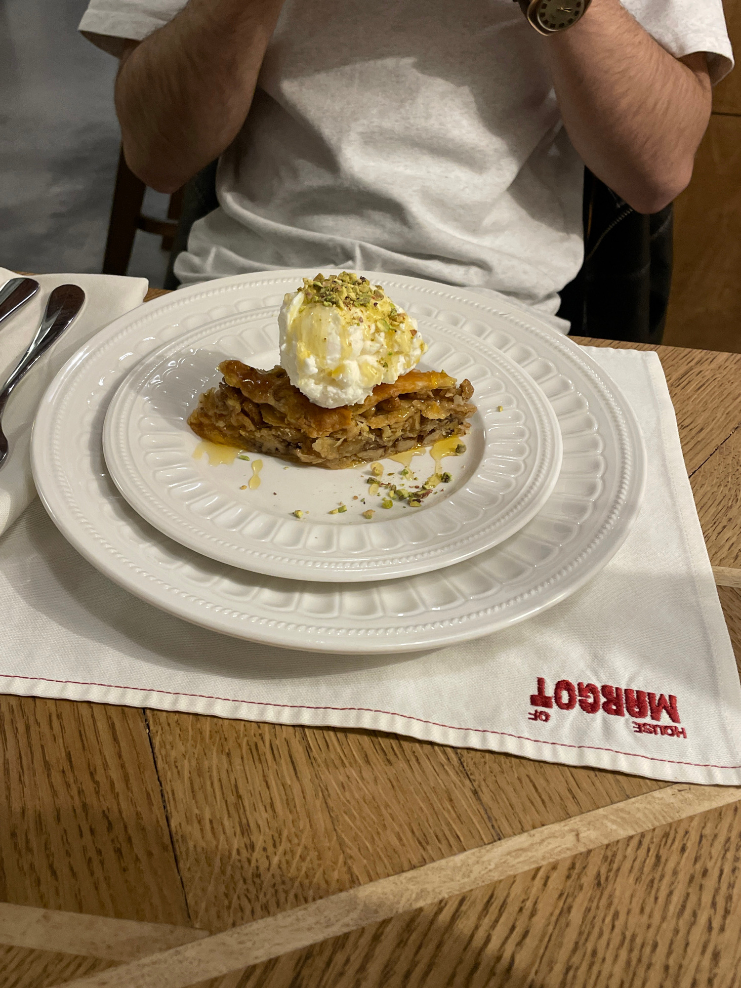 Here is a detailed description of the image: A high-angle shot shows a plate of food on a white napkin with red trim and the embroidered words "HOUSE OF MARGOT" in red. The food appears to be baklava…read more