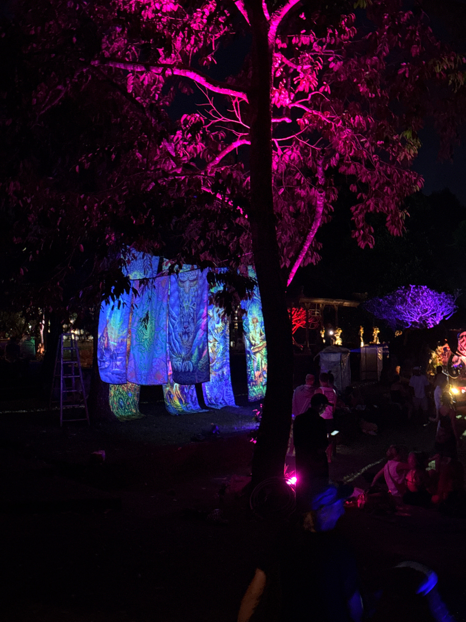 The image shows a night scene in Carangsari, Indonesia. A tree, illuminated with vibrant pink light, dominates the left side of the frame. To the right, a structure made of stacked, decorated boxes isβ¦read more