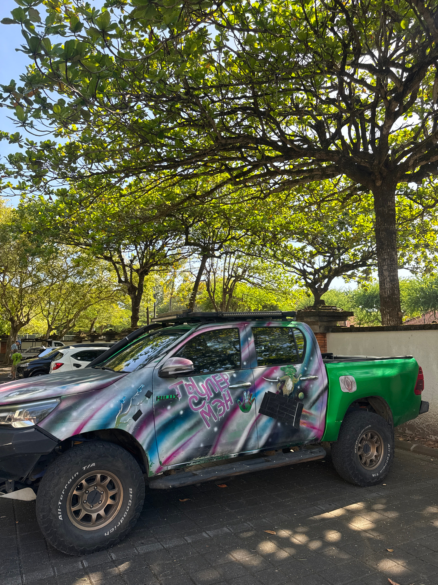 The image shows a parking area in Kuta Selatan, Indonesia, lined with trees that cast shadows on the brick-paved ground. A parked, customized green and painted pick-up truck with large tires takes up…read more
