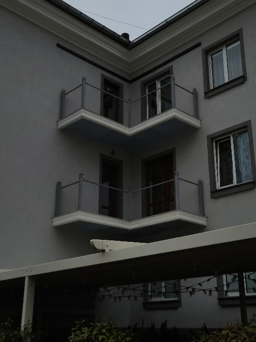 An exterior view of a grey-colored building in Krasnodar, Russia, under an overcast sky is depicted. The primary focus is a prominent architectural corner featuring two stacked, L-shaped balconies. Ea…read more