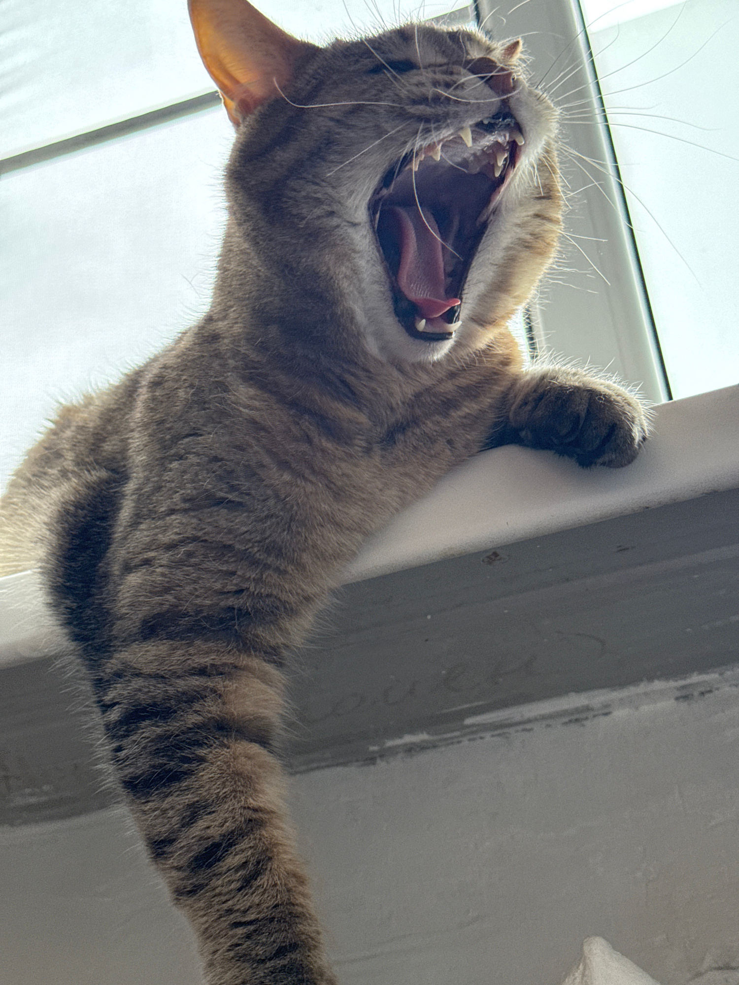 An angled, close-up shot captures a brown and grey tabby cat in the midst of a wide yawn or stretch. The cat's mouth is open, showcasing its sharp teeth, pink tongue, and the roof of its mouth. Long,…read more
