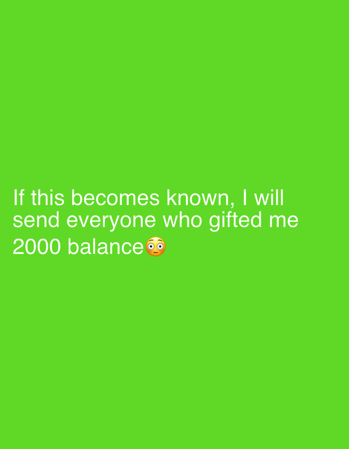 The image shows a solid green background with white text that reads, "If this becomes known, I will send everyone who gifted me 2000 balance π³". The emoji is a pair of wide-open eyes. There is no visβ¦read more