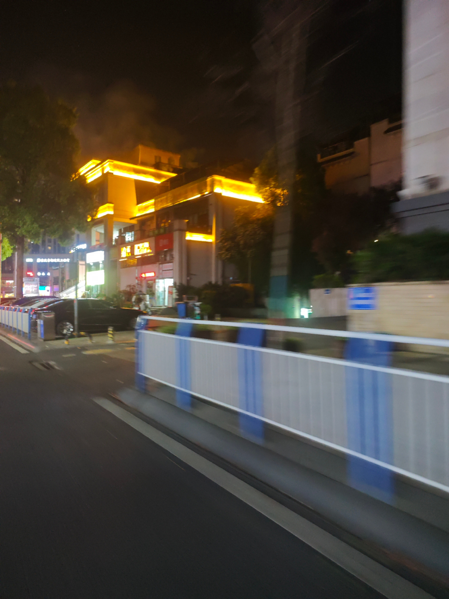 Captured at night in the Chongqing High-tech Zone, China, the image shows an urban street scene. A multi-story building with illuminated yellow trim dominates the background. Various shops and signs a…read more