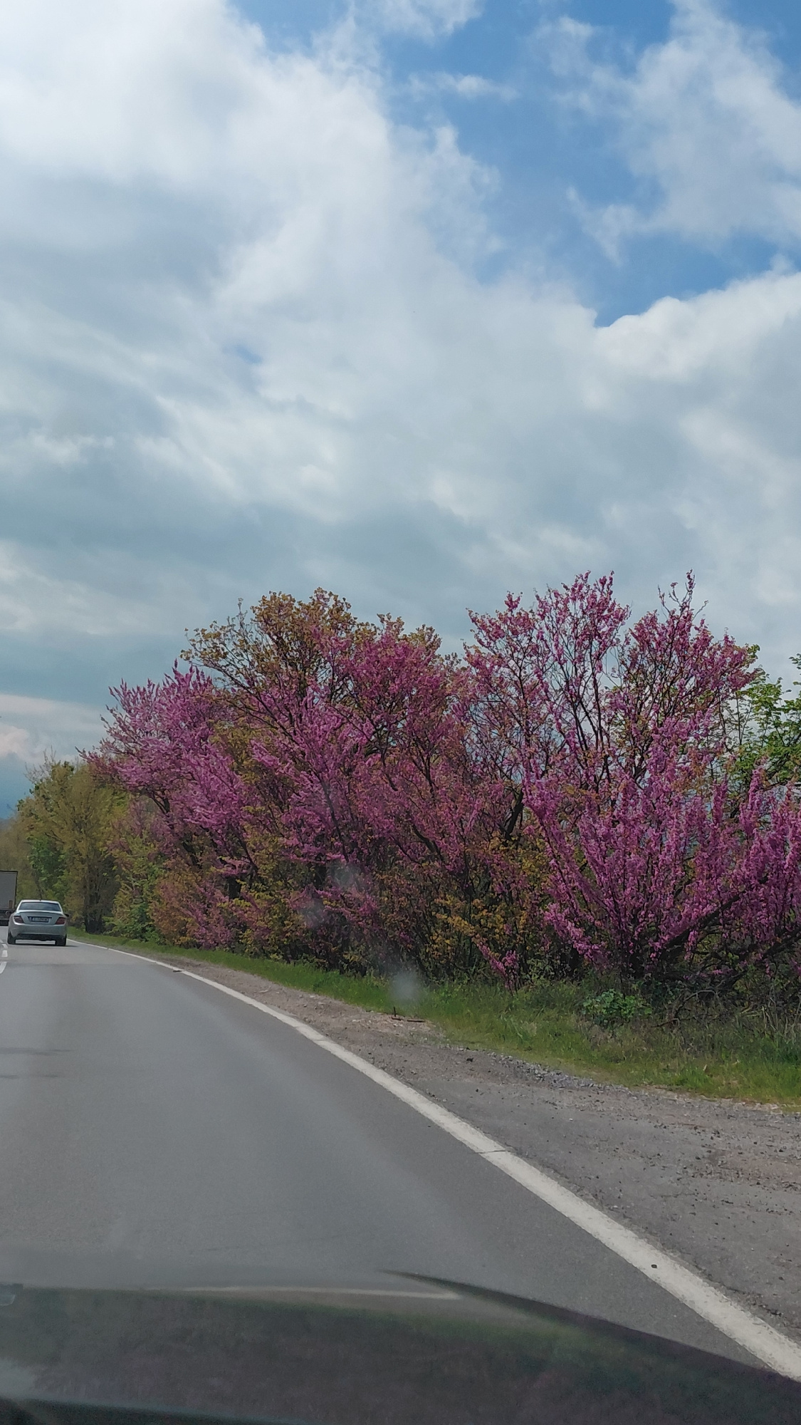 The image depicts a road scene under a cloudy sky. A gray asphalt road with a white line marking the edge curves to the right. On the right side of the road, there are trees with vibrant pink blossoms…read more