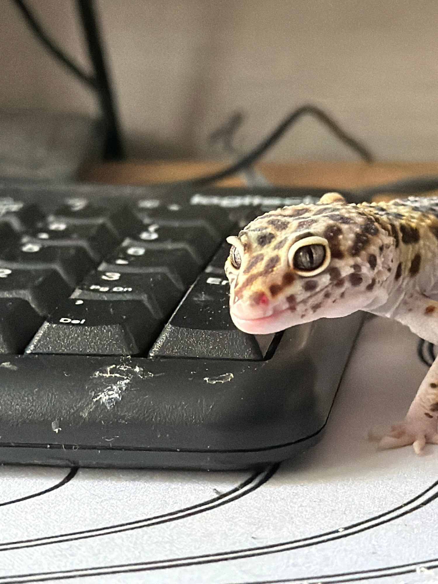 A close-up, top-down shot features a leopard gecko perched on the edge of a black computer keyboard in an indoor setting, likely Izhevsk, Russia. The gecko, with its characteristic spotted pattern of…read more