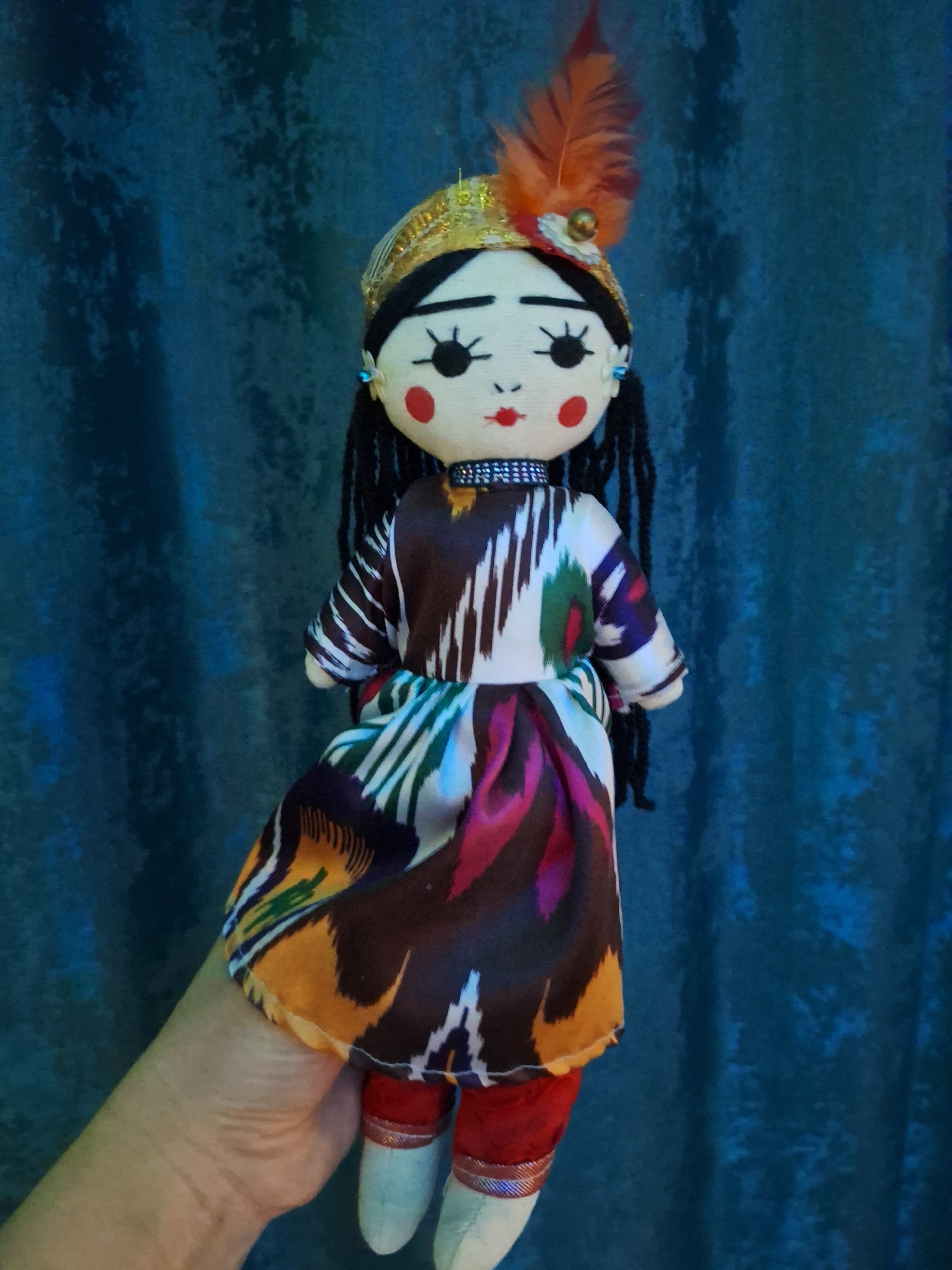 The image displays a vibrant, handmade doll held by a person's hand against a textured, dark teal background. The doll features a white fabric face with simple black stitched eyes, radiating lashes, r…read more