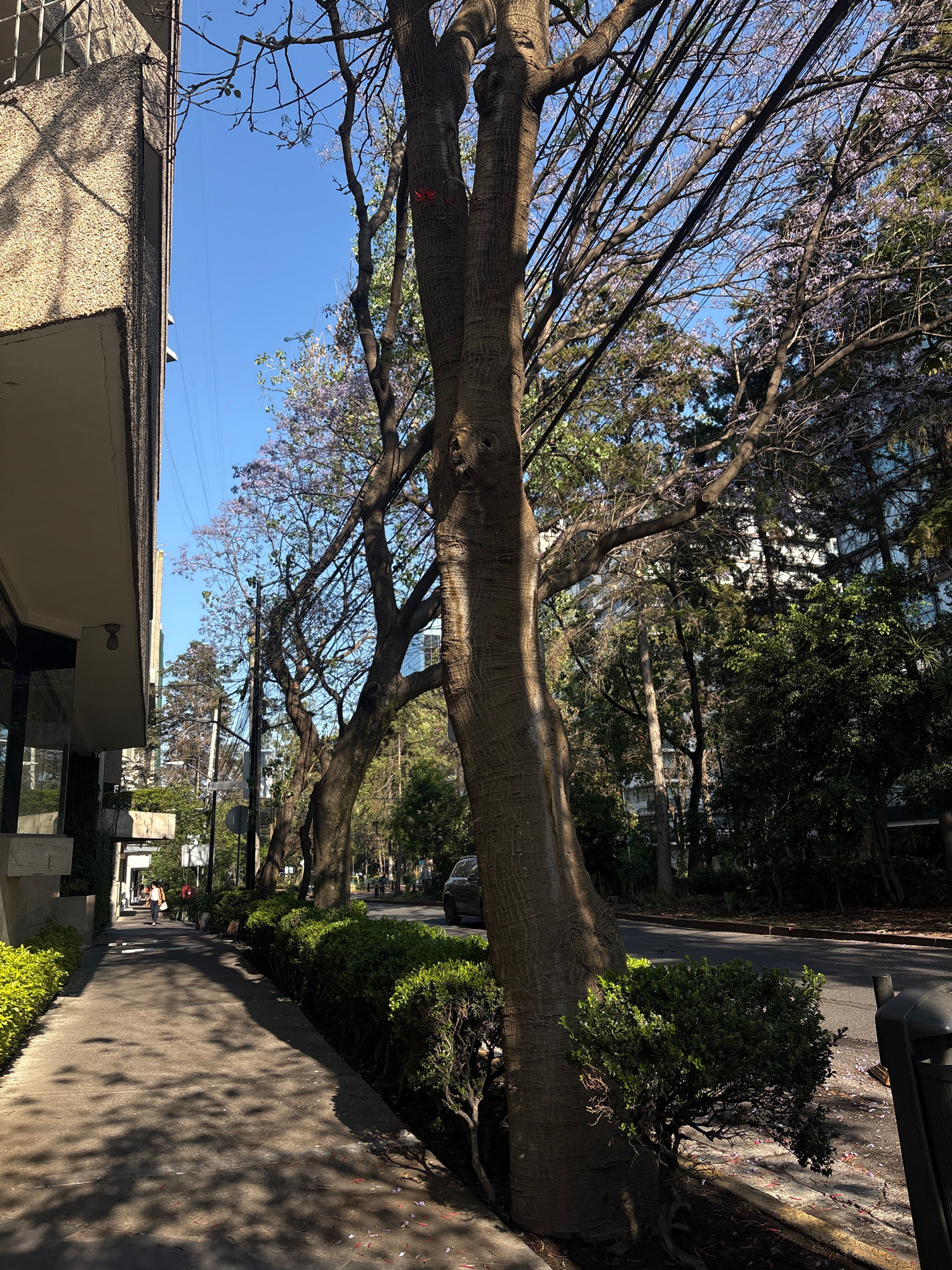 The image depicts a street scene in Mexico City, Mexico. A large tree with light purple flowers dominates the foreground, its branches stretching across the frame and obscuring part of the sky. Powerβ¦read more