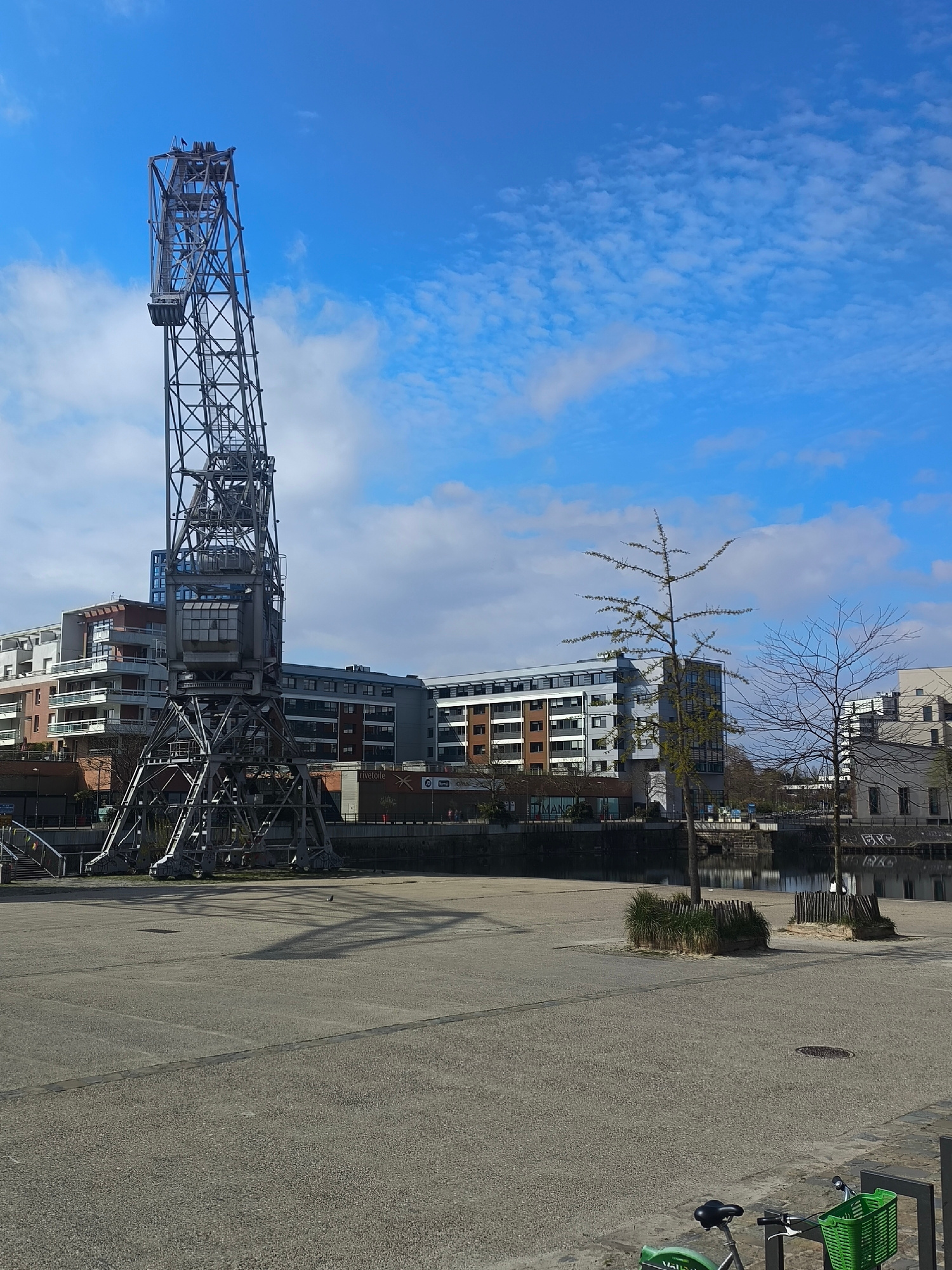 The image depicts a sunny, daytime scene in Strasbourg, France, featuring the "Grue Jaune" (Yellow Crane) or "Grue à Tour" (Tower Crane), a historical port crane. The crane, constructed of steel, stan…read more