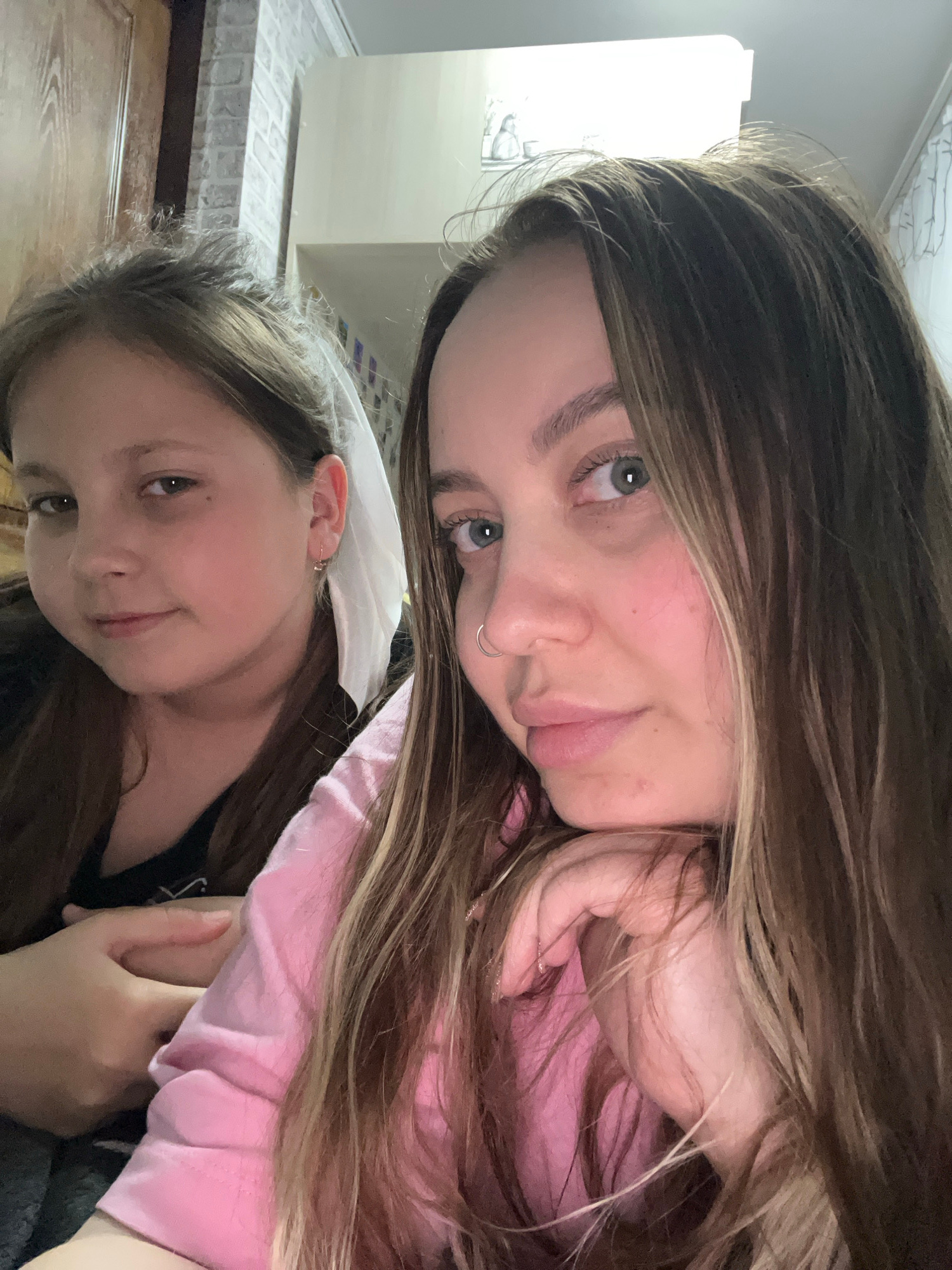 Two females, one a young girl and the other a young adult, pose for a selfie-style photograph indoors. The young adult, positioned higher in the frame, has long brown hair with lighter highlights, lig…read more