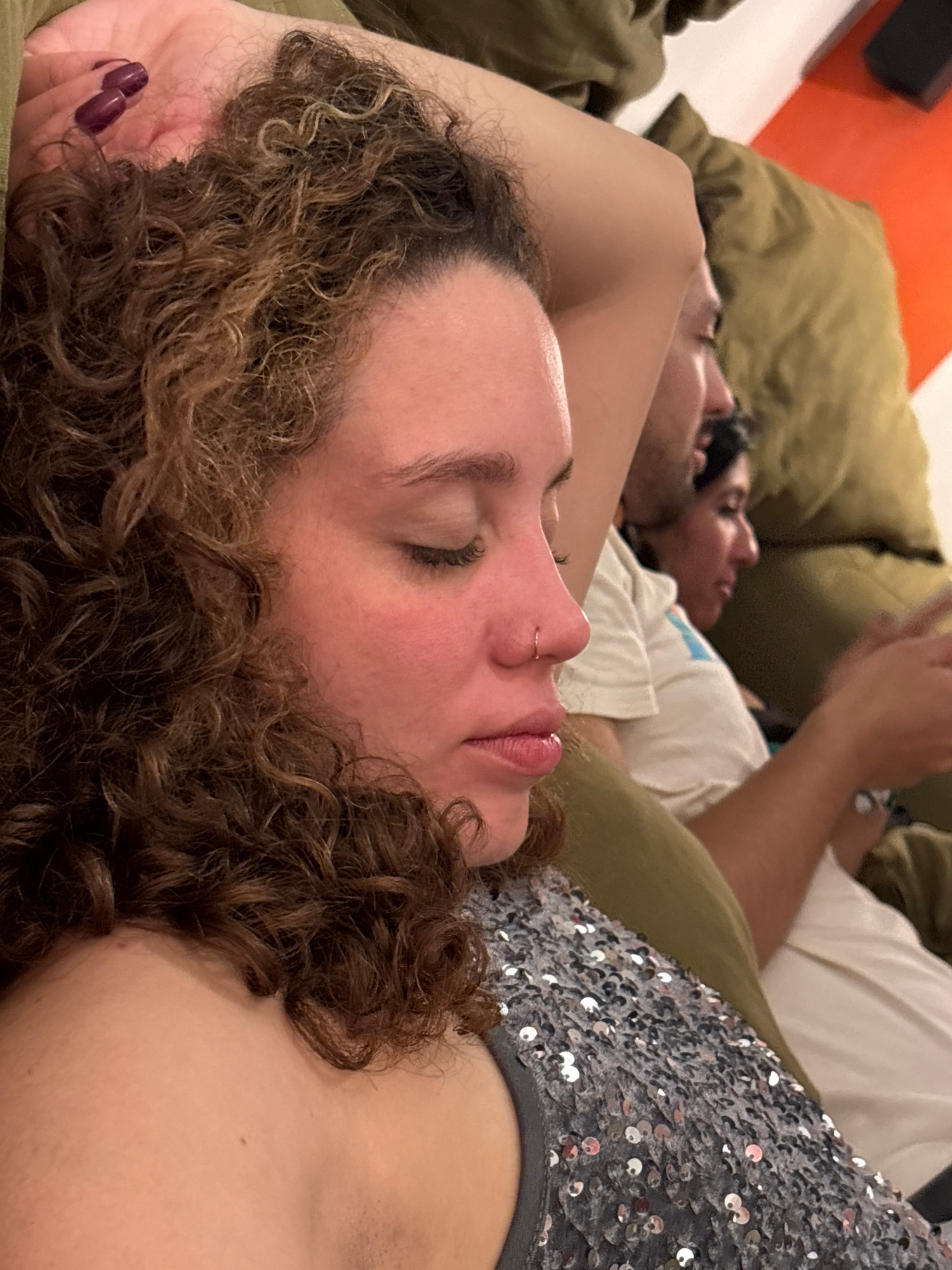 Three individuals are visible in the image, presumably indoors. One individual is closest to the camera, lying down with brown, curly hair, fair skin, and a nose ring. They are wearing a silver sequin…read more