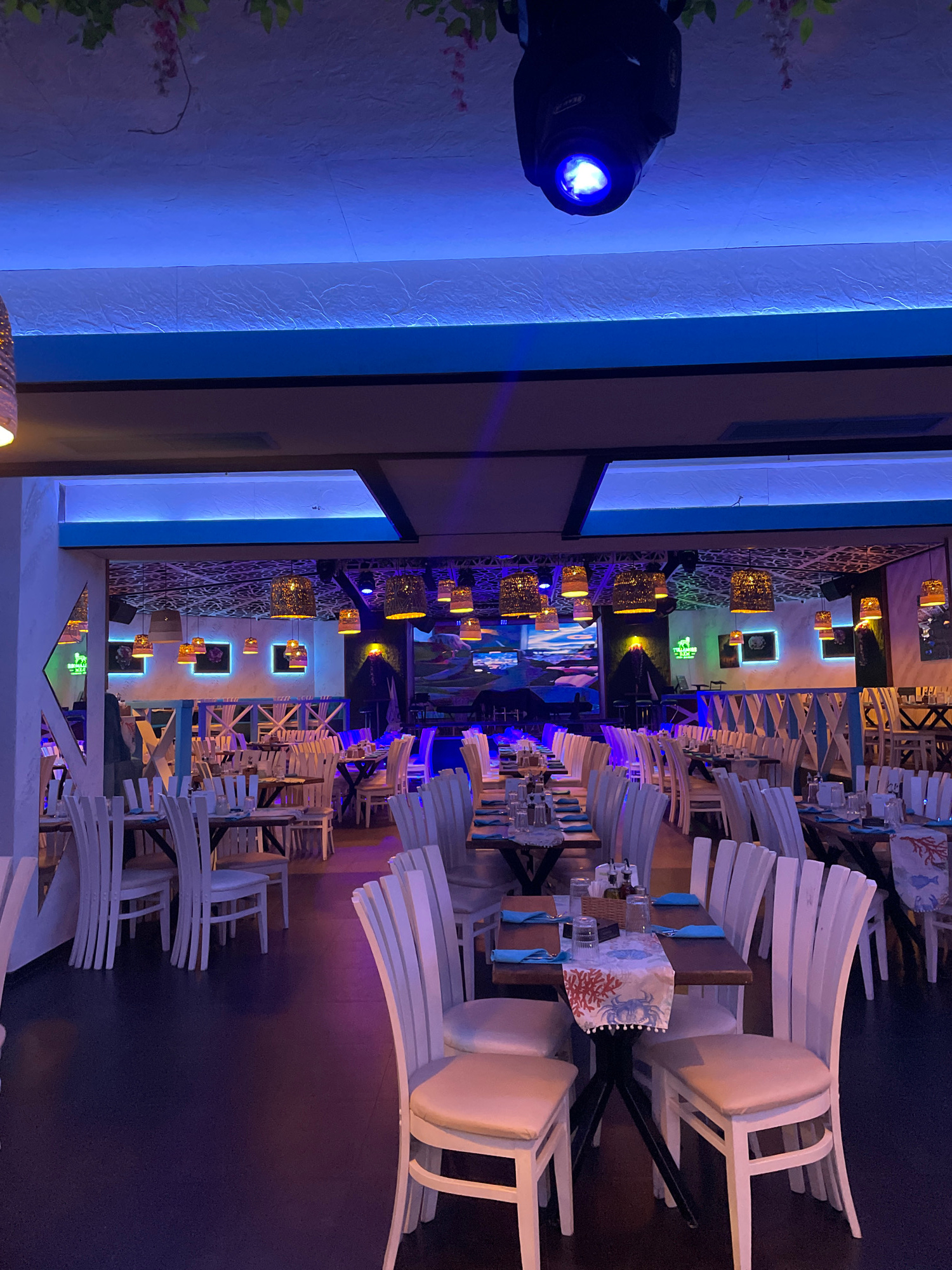 The image shows the interior of a restaurant or bar in Plovdiv, Bulgaria. The space features modern design elements with a predominant blue and white color scheme. Tables are set with chairs stacked a…read more