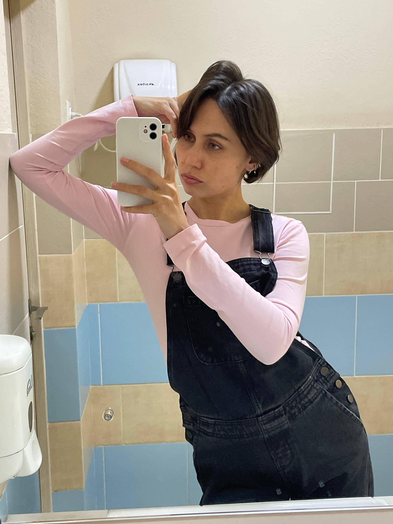 A person is captured in a mirror selfie within what appears to be a public restroom setting, in Izhevsk, Russia. The image itself is rotated 90 degrees clockwise, presenting the person and environment…read more
