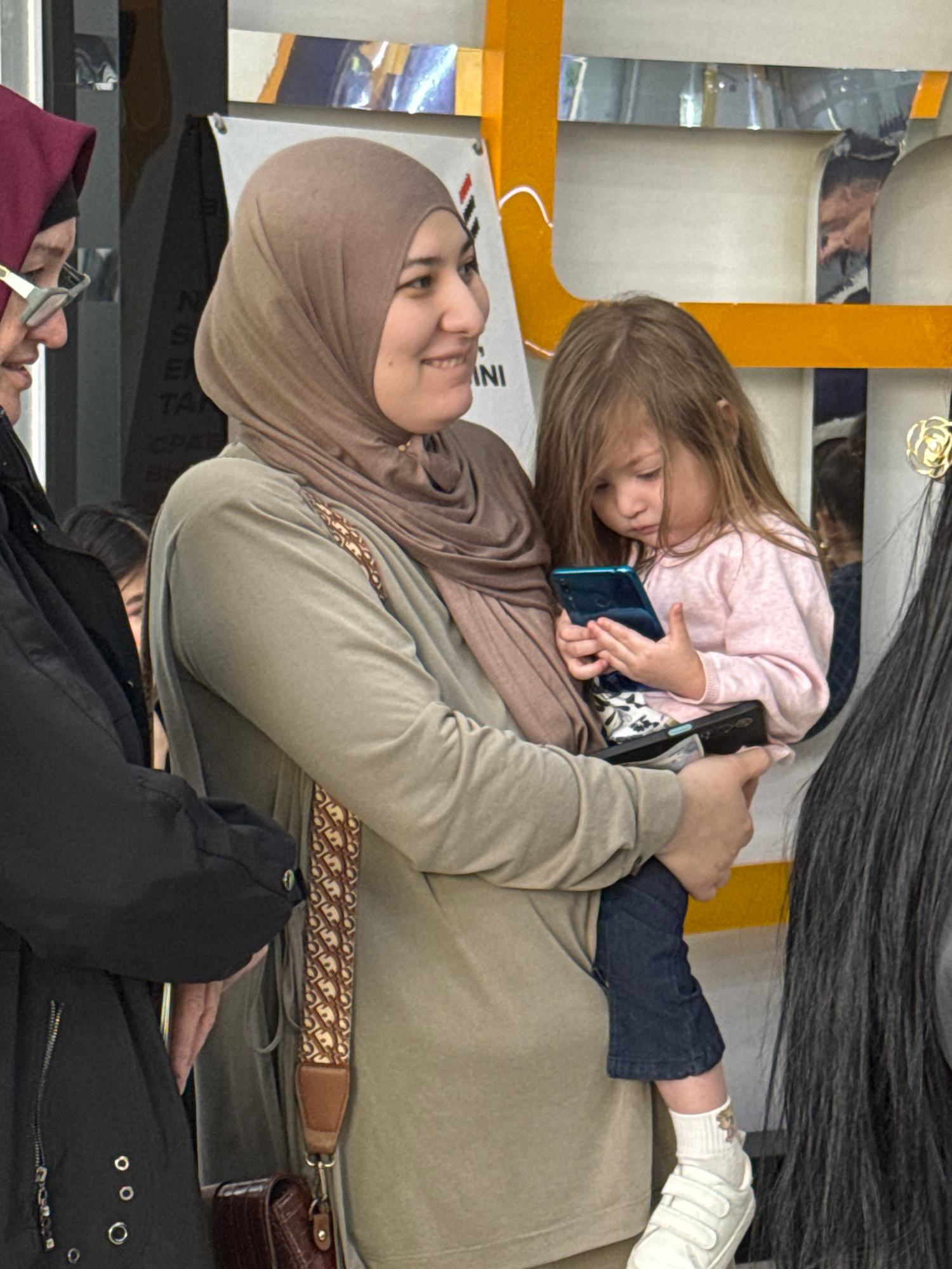 The image shows a woman wearing a hijab sitting down and holding a young girl on her lap. The girl is holding a blue smartphone, while the woman holds a black smartphone. Both are looking at the phone…read more