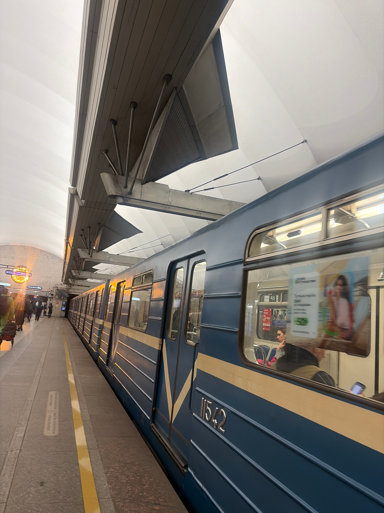 The image captures a modern subway station in Shushary, Russia, with a train stopped at the platform. The perspective is from the platform, looking down the length of the station, with the image rotat…read more
