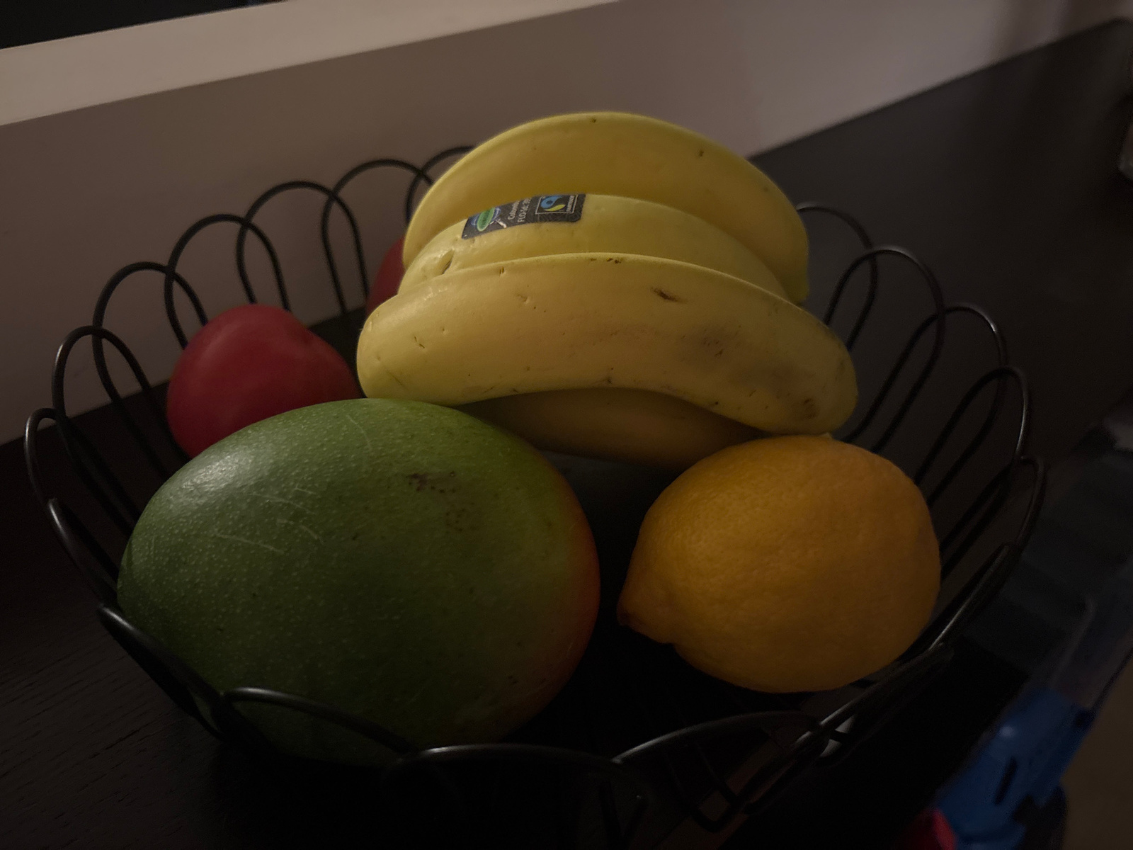 A black metal fruit bowl filled with bananas, a mango, a lemon, and a red apple sits on a dark surface. Three bananas are piled on top of each other, with a label visible on one. The mango, green with…read more