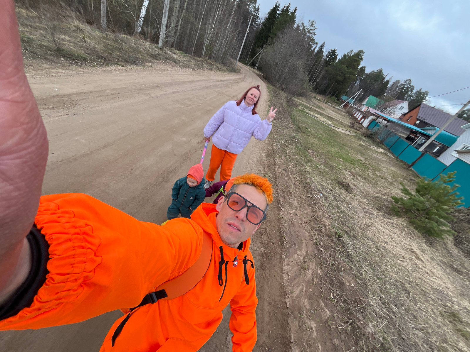 An outdoor, rotated image, set in Chaikovsky, Russia, features three individuals on a dirt road, likely during a casual outing or walk. The main subject, an adult with orange-dyed hair and orange-tintβ¦read more