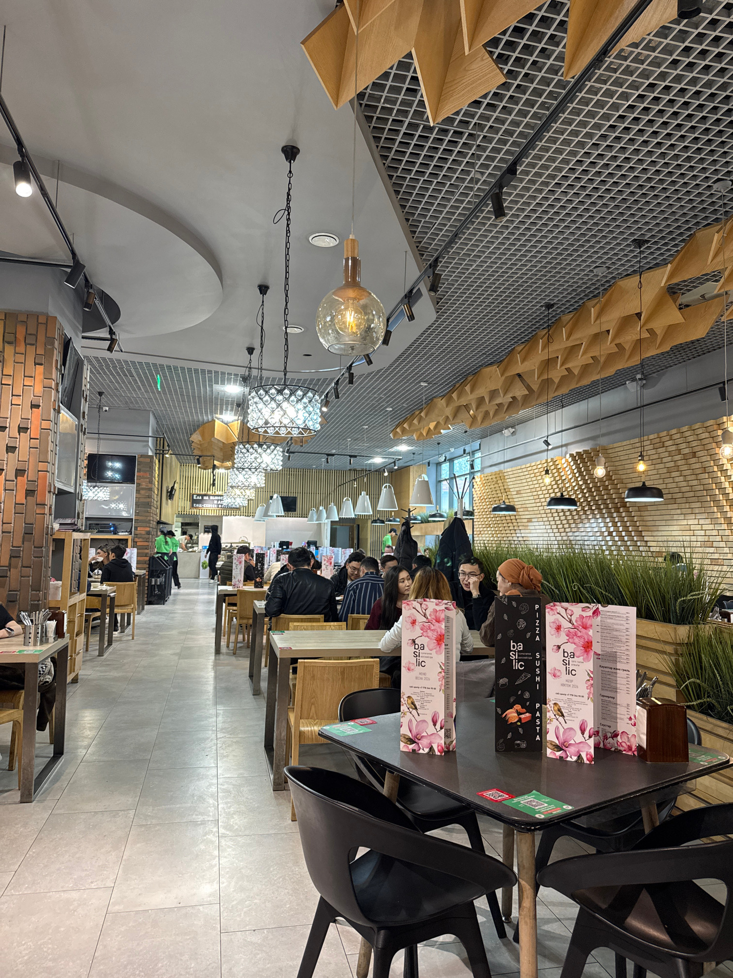This image captures the interior of a bustling modern restaurant or cafe, likely during the daytime or early evening. The setting features a contemporary design with a mix of industrial and warm eleme…read more