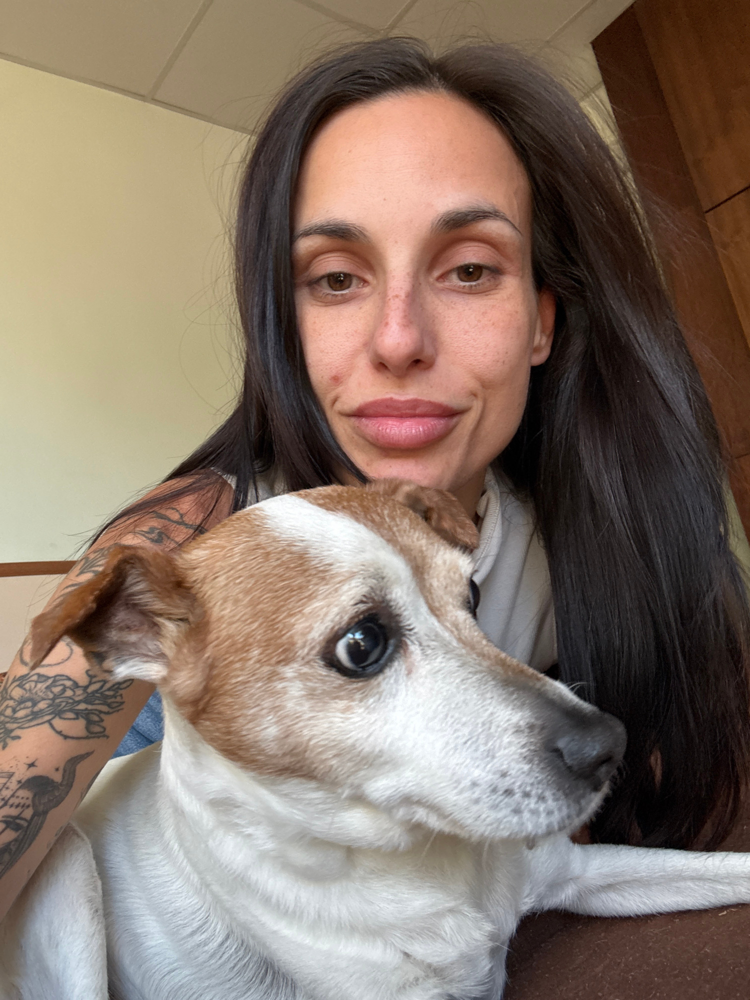 A woman with long dark hair is lying on a brown surface, facing the camera. To her right is a dog with tan and white fur. The woman has light skin, brown eyes, and is wearing a light-colored shirt. Thβ¦read more