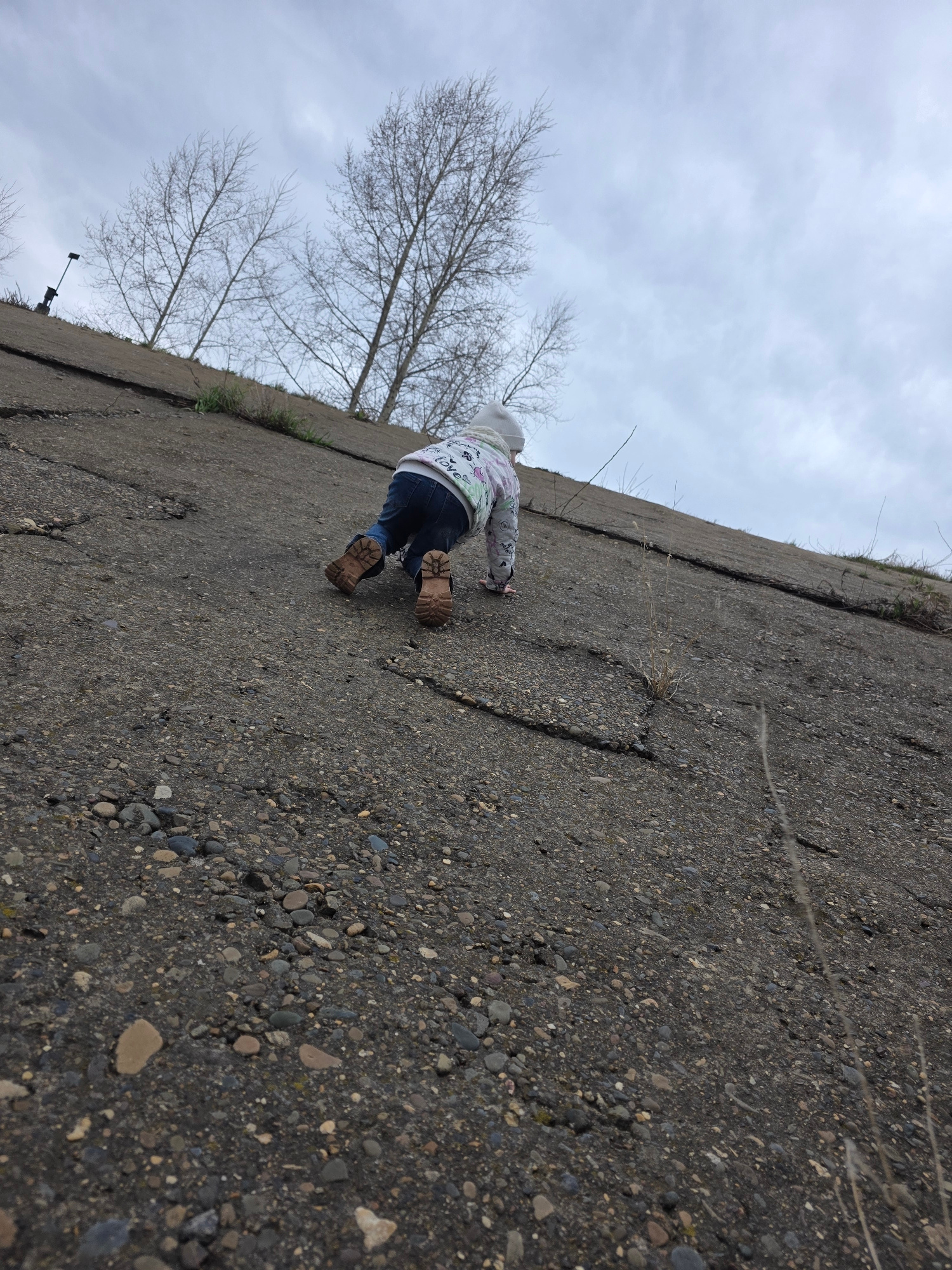 A child, dressed in a white patterned hoodie, dark jeans, and brown boots, is crawling up a weathered, gray concrete slope. The concrete surface is cracked and embedded with small rocks. Sparse, dry g…read more