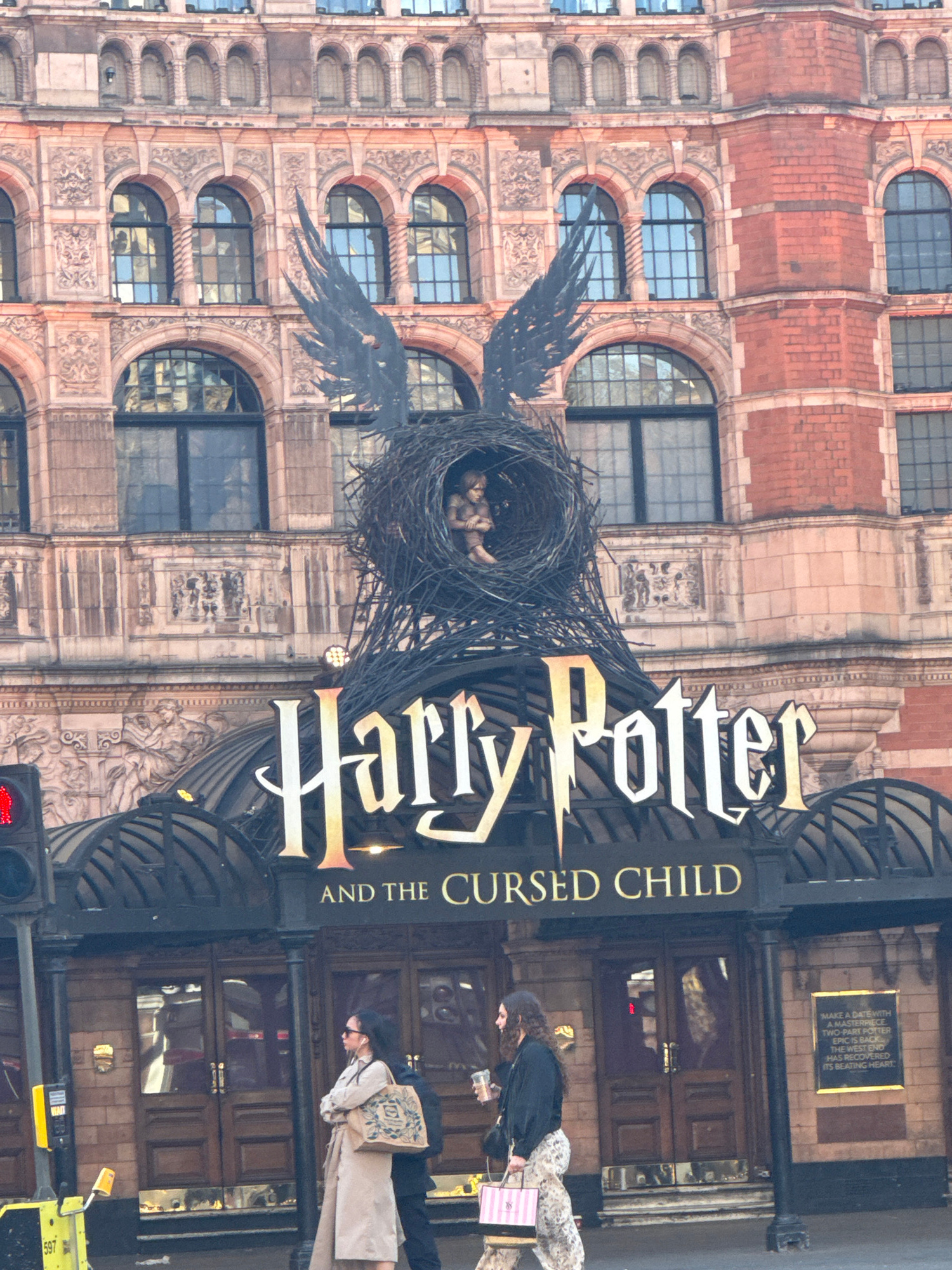 The image captures the exterior of the Palace Theatre in London, showcasing the "Harry Potter and the Cursed Child" play. A large nest with wings is centrally positioned above the theater's entrance,…read more