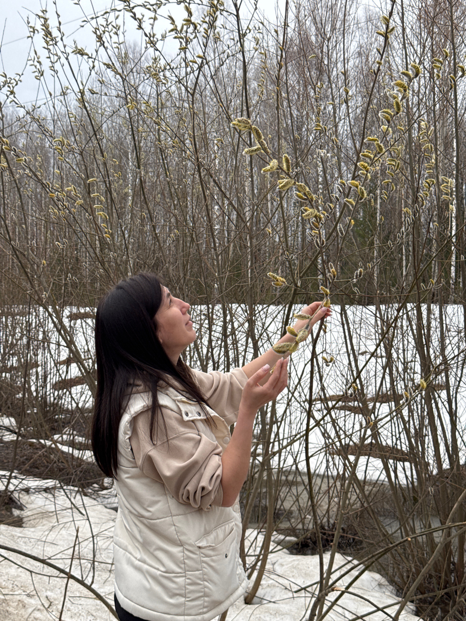 The image shows a woman standing in a wooded area near a city identified as Unknown, Unknown. She is examining pussy willow branches. The ground appears to be snow-covered.