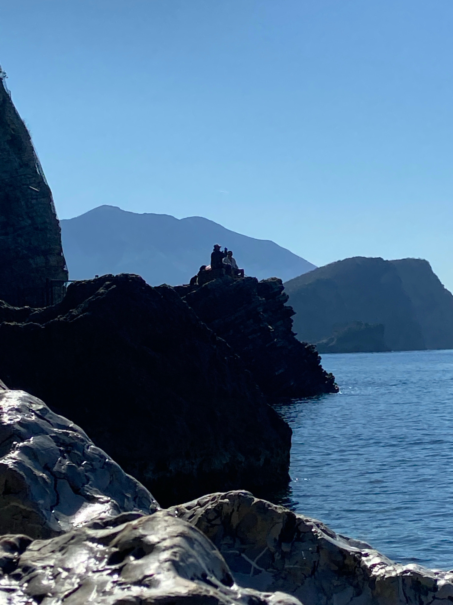A landscape image depicts dark, wet rocks in the foreground, possibly cliffs or formations near the sea, glistening from moisture. Behind the rocks, the sea meets the rocks. A line of mountainous terr…read more