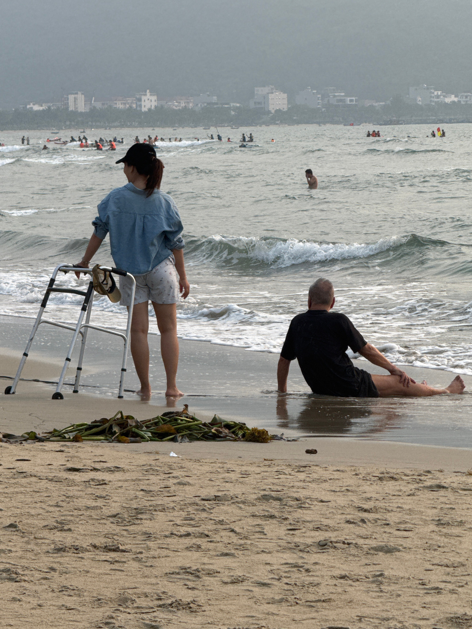 An eye-level, medium shot photograph shows an overcast day at the beach in Đà Nẵng, Vietnam. In the foreground, a woman in a short-sleeved blue shirt, patterned shorts, and a dark-colored hat is stan…read more