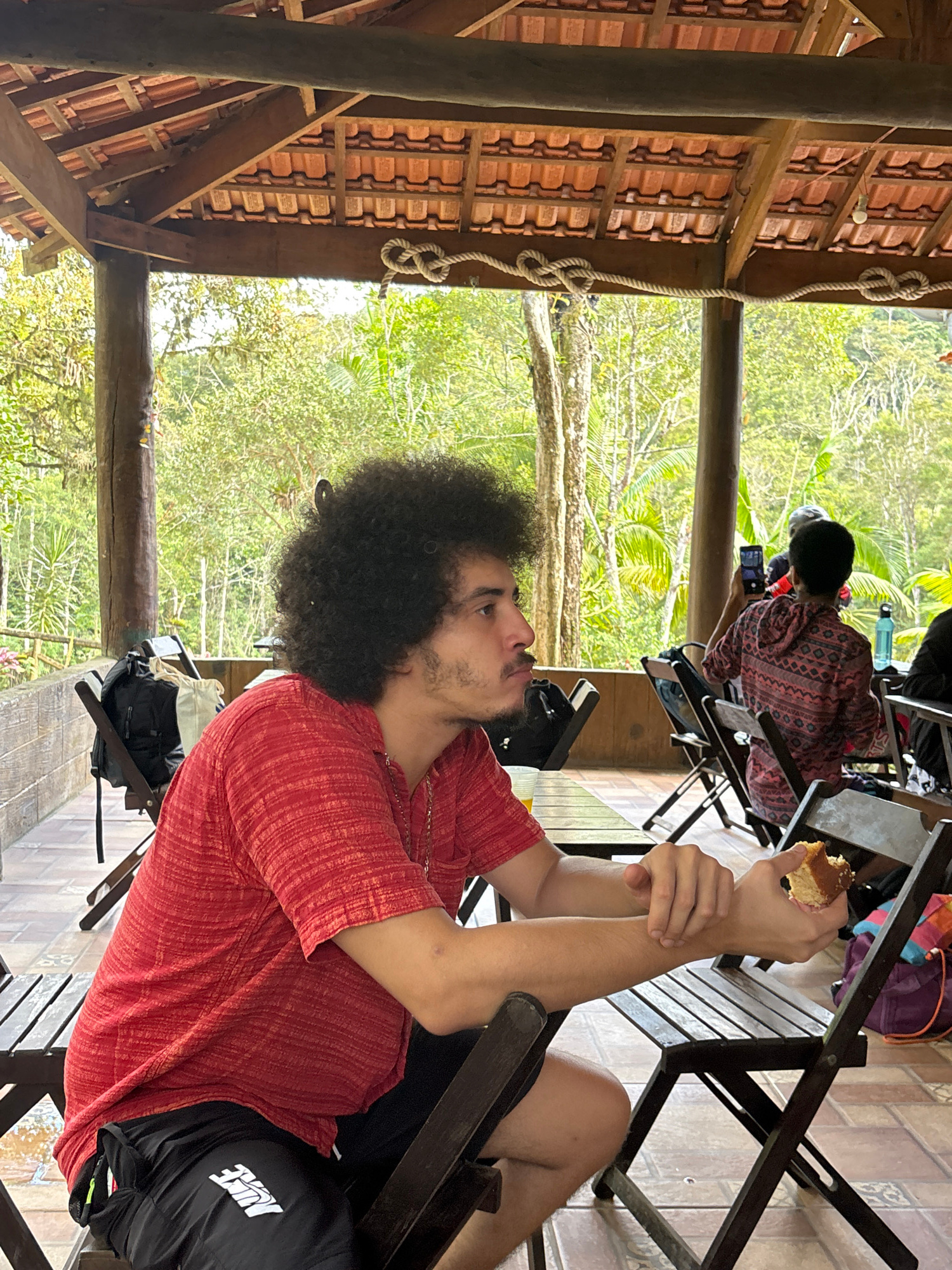 A person with dark, curly hair is sitting on a wooden chair, holding a piece of cake. They are wearing a red, short-sleeved shirt and black shorts. A black backpack with a white "Nike" logo is next to…read more