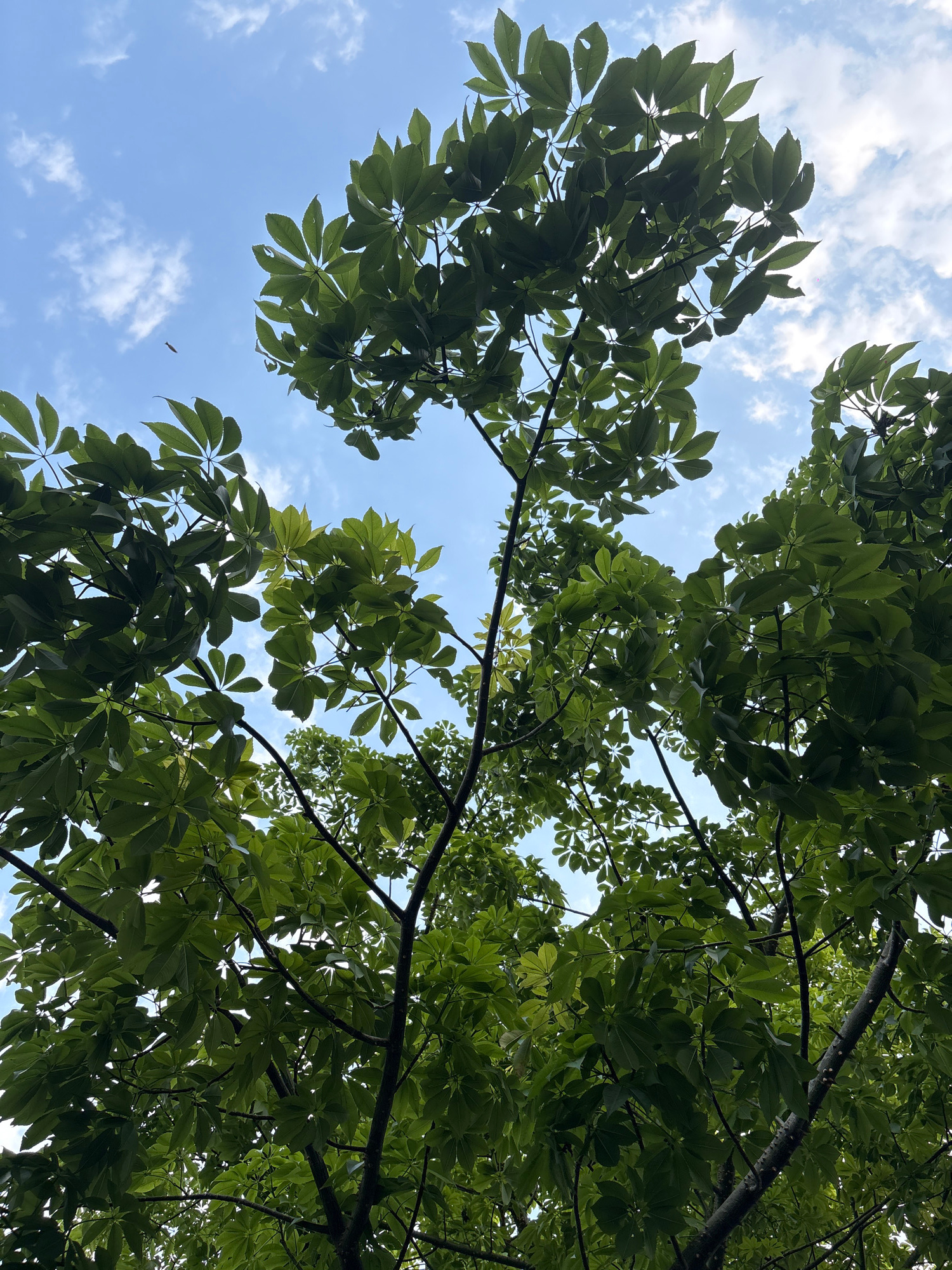 The image shows a view looking up into a canopy of green leaves against a blue sky with scattered white clouds. The leaves are clustered in groups, suggesting they belong to one or more trees with com…read more