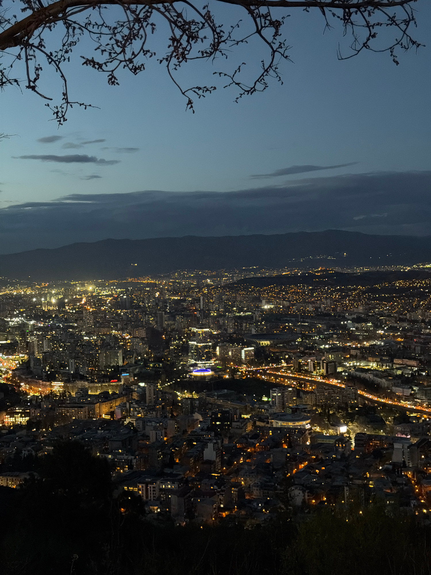 The image shows a nighttime view of Tbilisi, Georgia, likely from a high vantage point. The city lights stretch across the scene, with darker mountain ranges visible in the distance under a twilight sā¦read more