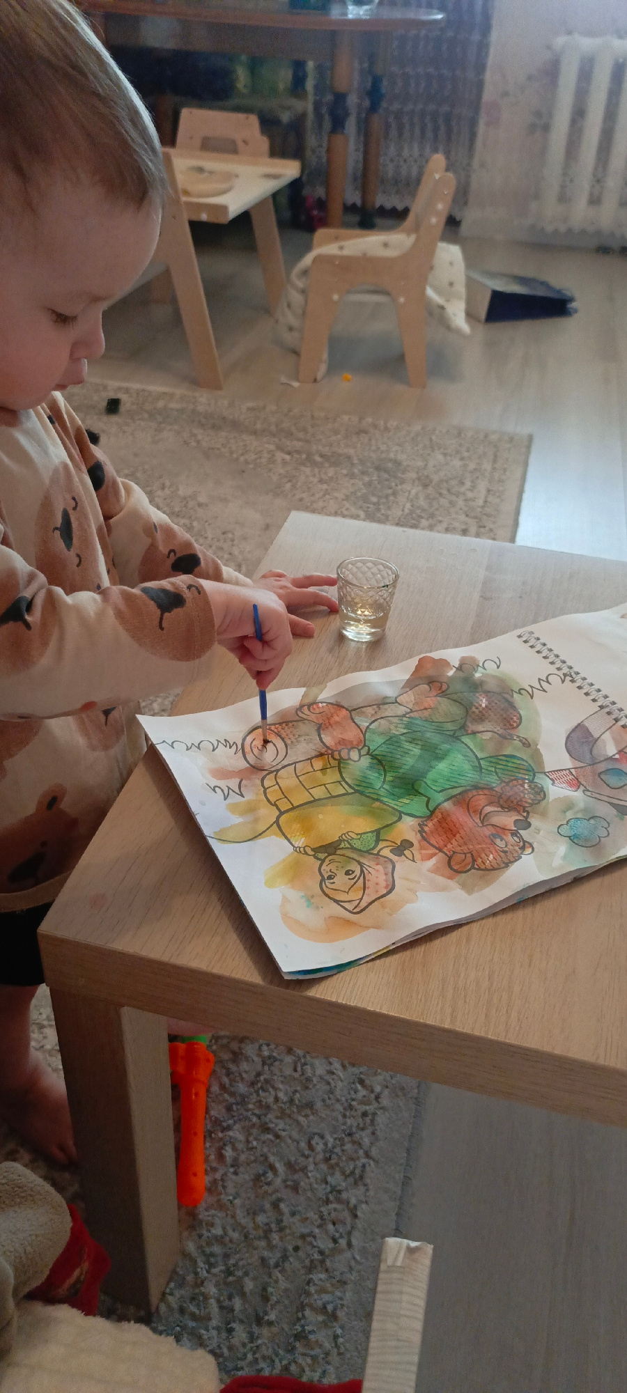 A young child, likely a toddler, with light hair and fair skin, is captured from a side perspective, deeply engrossed in a painting activity. The child is wearing a light-colored long-sleeved top patt…read more