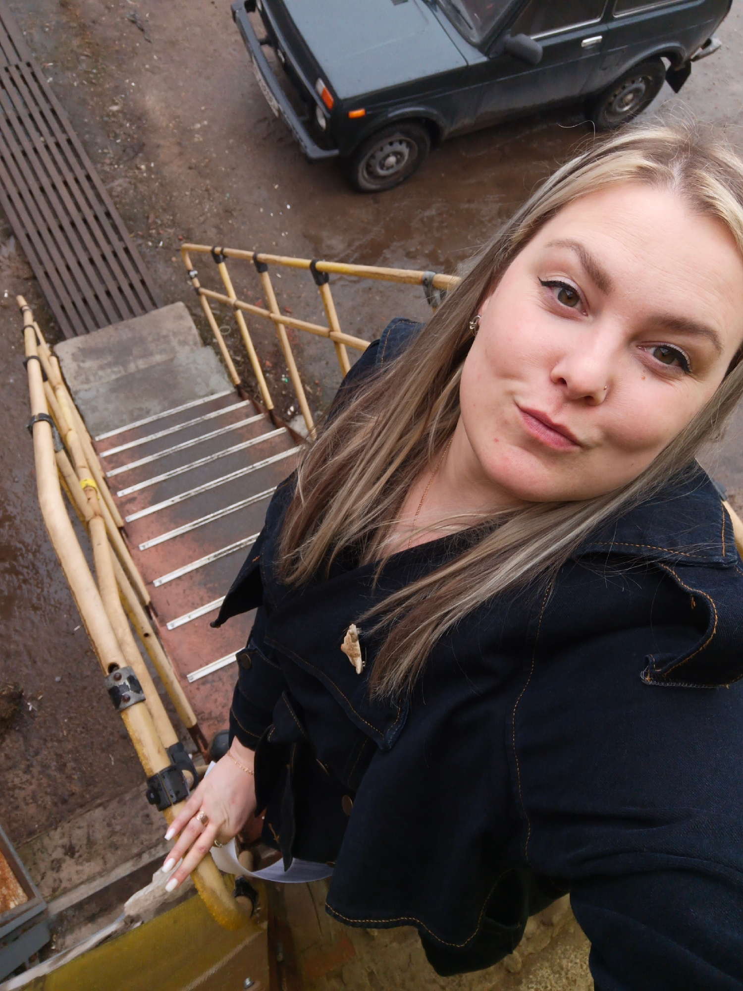 A woman with blonde hair and a denim jacket is taking a selfie from a high angle, standing on a set of stairs with yellow railings. The stairs are painted in alternating shades of gray and orange. The…read more