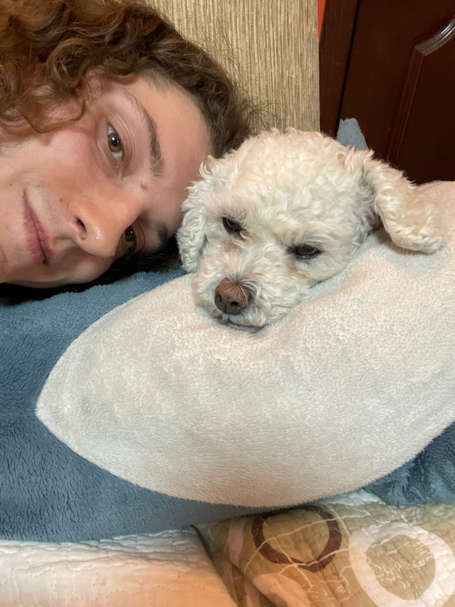 A selfie shows a person with curly brown hair and fair skin, lying down. Next to the person is a white, fluffy dog resting on a blue and white pillow. The location is unknown and cannot be determined.