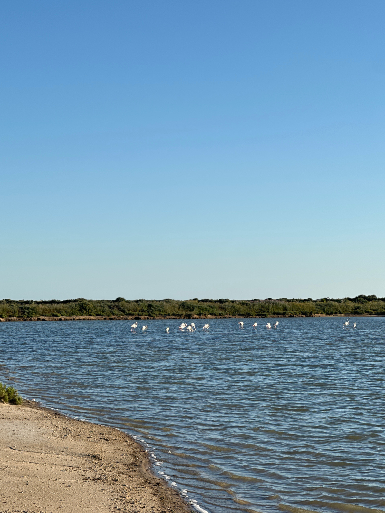 The image shows a view of a lagoon or coastal area near Olhão, Portugal. The sky is a gradient of blue, with lighter tones near the horizon. A body of water, presumably part of the Ria Formosa lagoon…read more